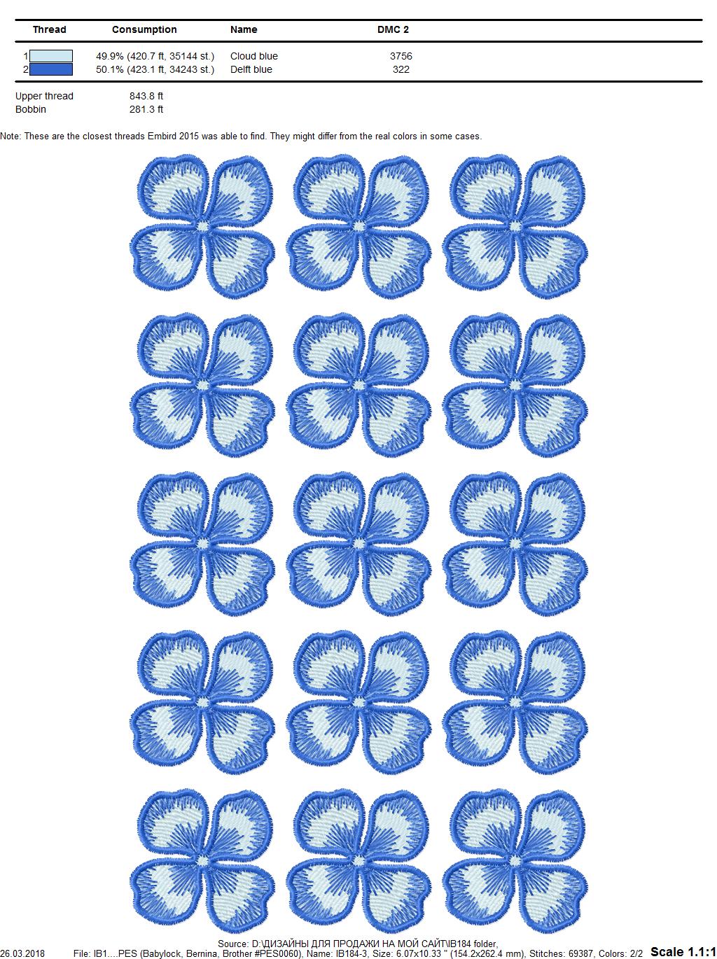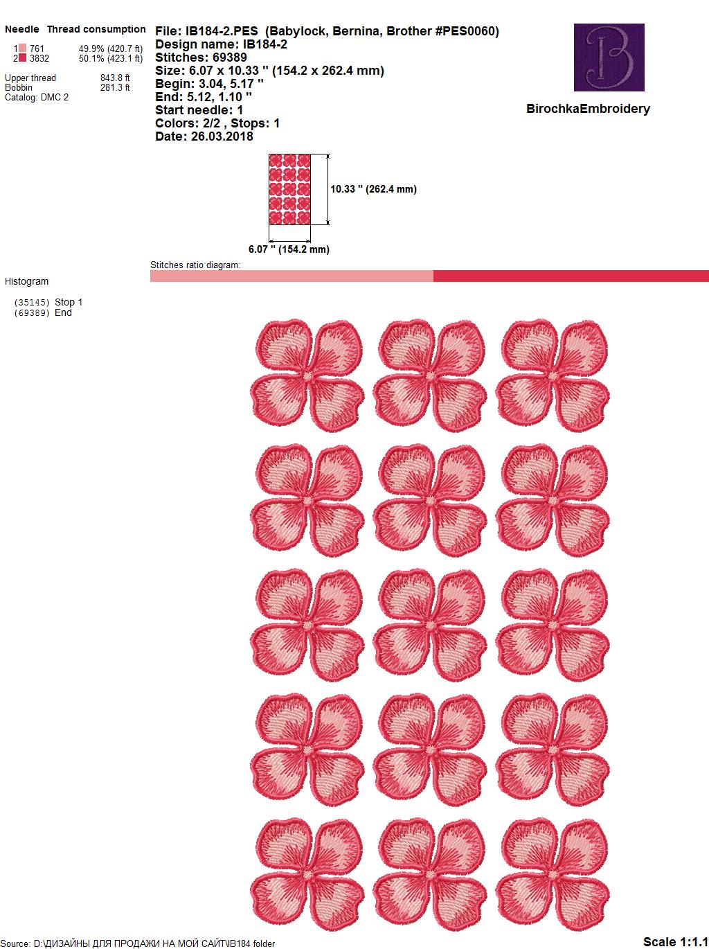 Design size flowers (15 flowers): 154,2 mm X 262,4 mm (6,07 X 10,33 inches)