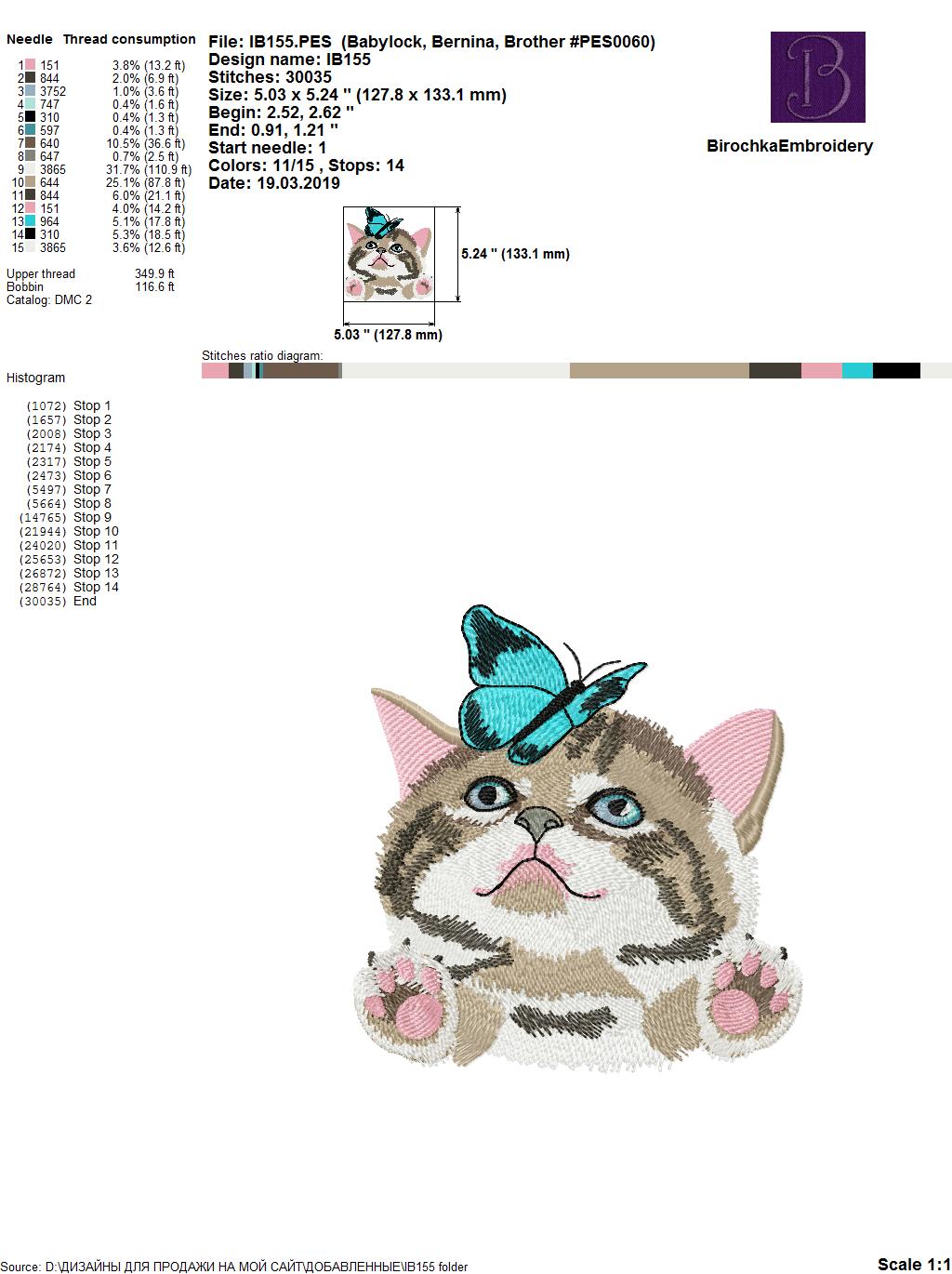 Дизайн машинной вышивки «Котёнок с бабочкой»