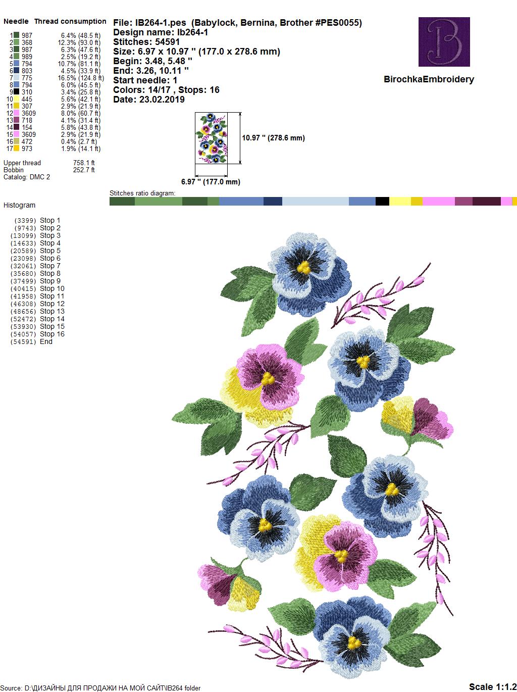 Размер дизайна IB264-1 регулярная вышивка: 177 мм X 278,6 мм (6,97 X 10,97 дюймов)Количество цветов: 14