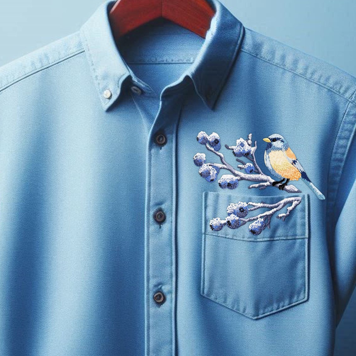 Дизайн машинной вышивки «Синица и голубика» создан для вышивки и декора карманов. Часть ветки вышивается на самом кармане, а основная часть ветки с синицей вышивается чуть выше кармана. Дизайн в двух размерах.