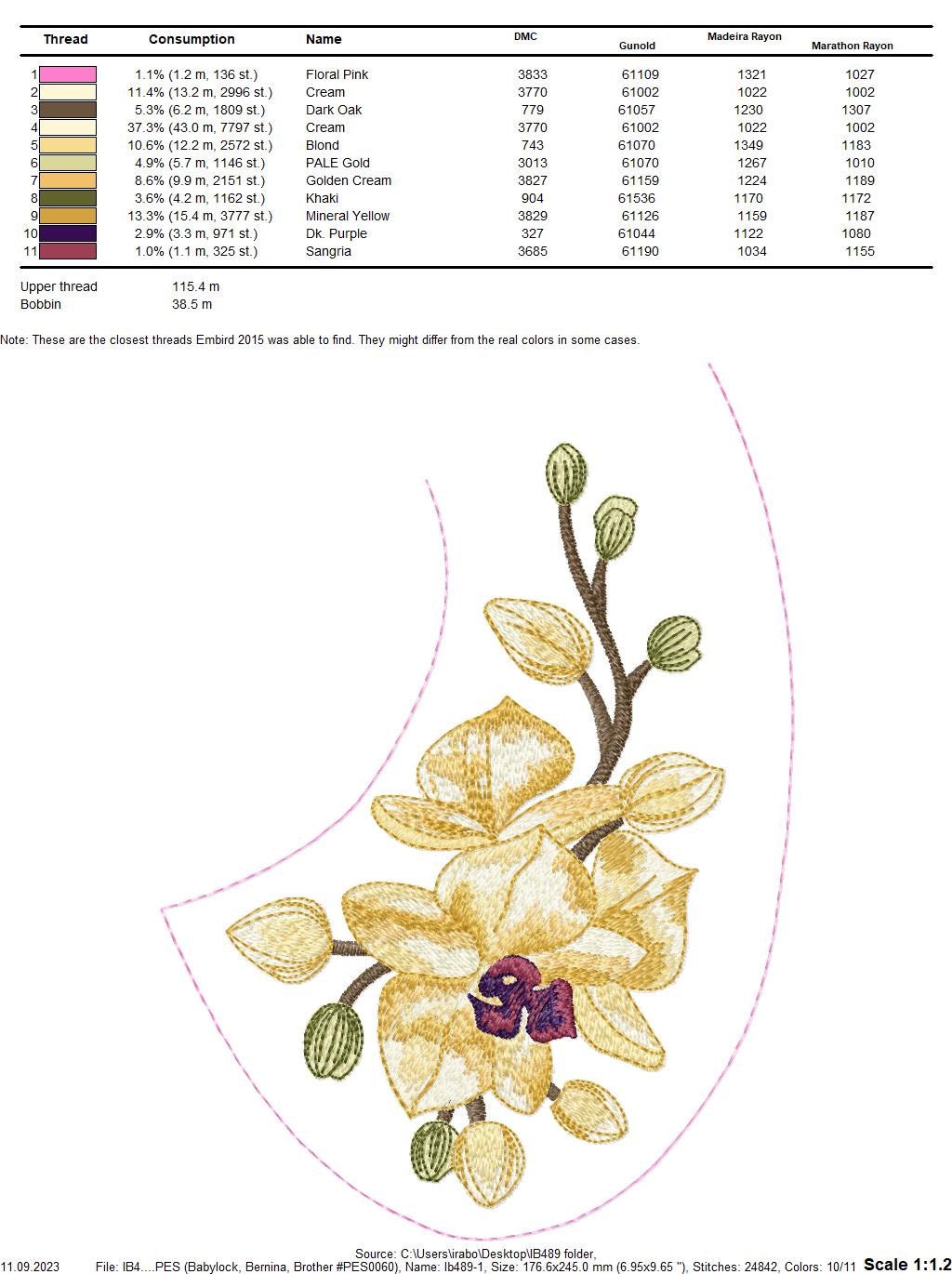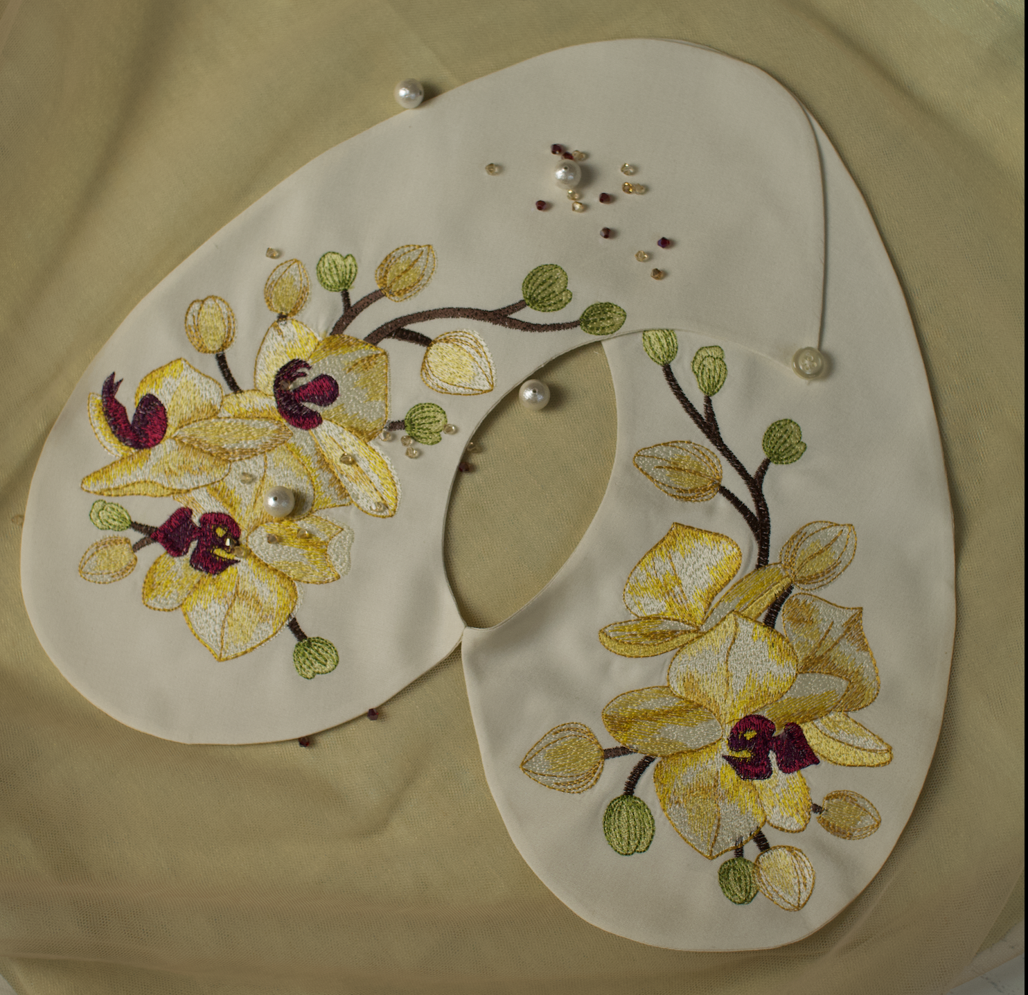 Дизайн создан специально для вышивки воротников. Первый цвет в дизайне показывает примерную форму выкройки воротника, так же помогает пришить ткань к стабилизатору перед вышивкой узора.