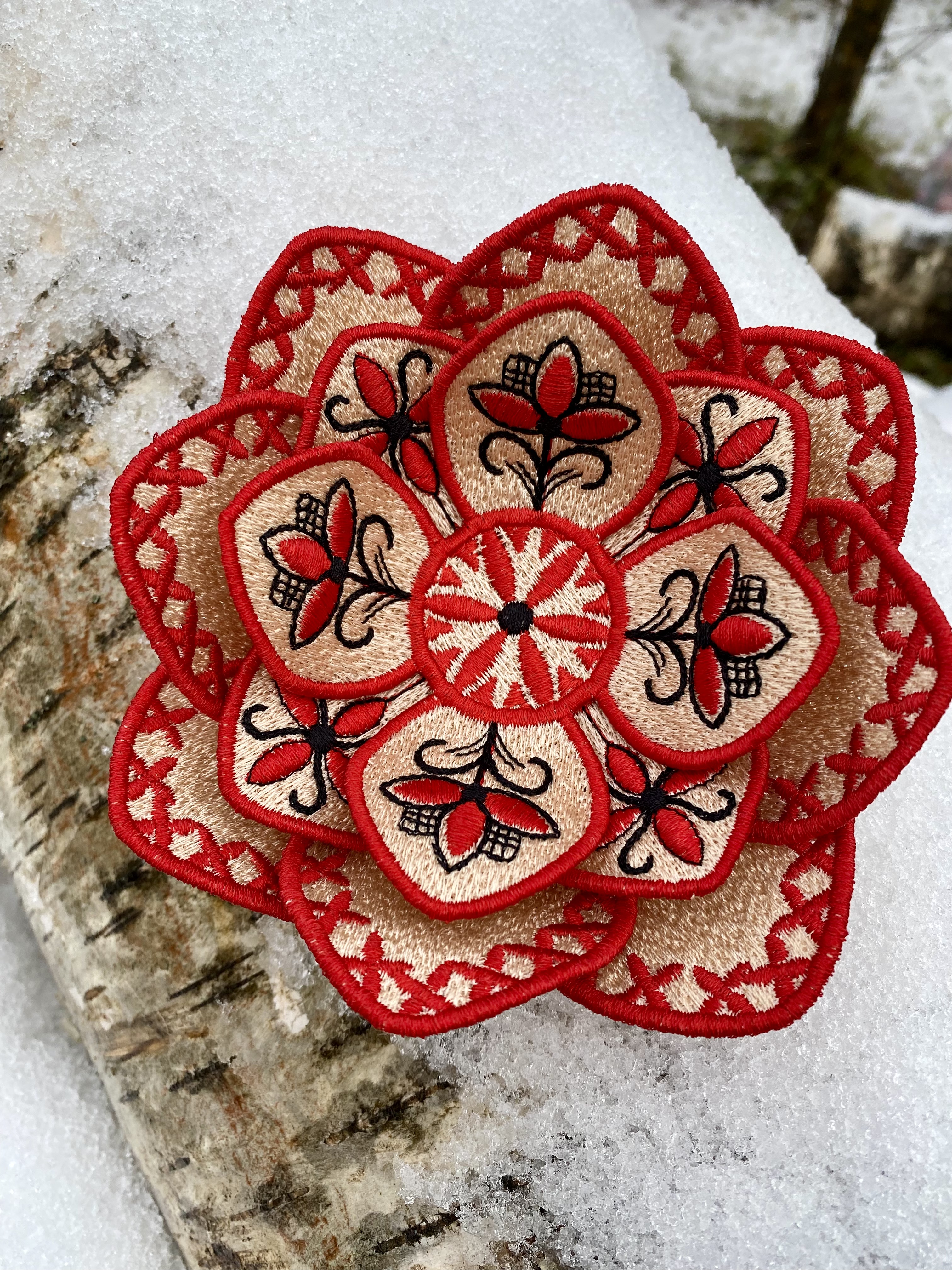 Fantasy flower brooch by FSL in the Mezen painting style, machine embroidery design