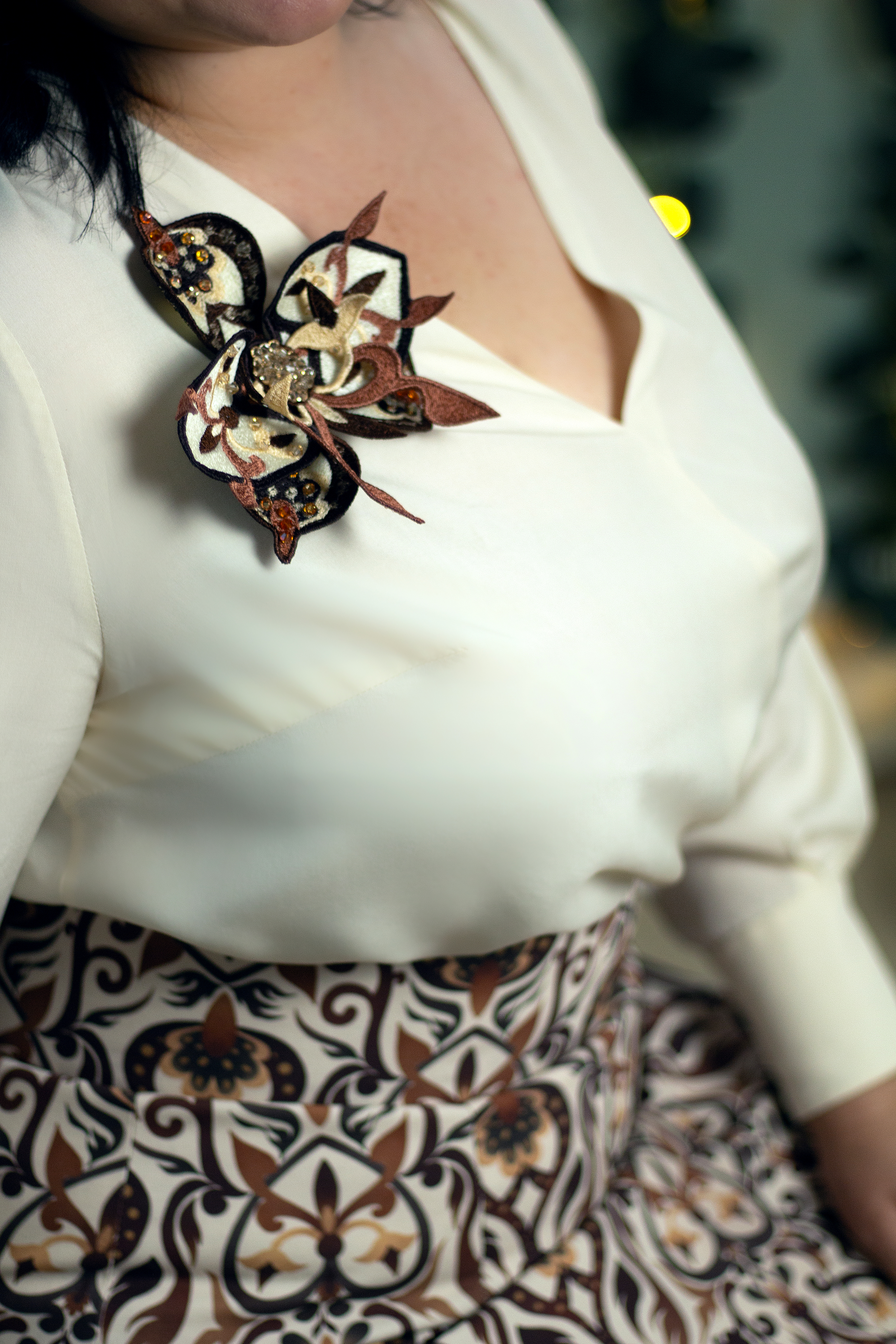 Machine embroidery design stylized flower brooch is created as an additional accessory to fabric with a designer print.