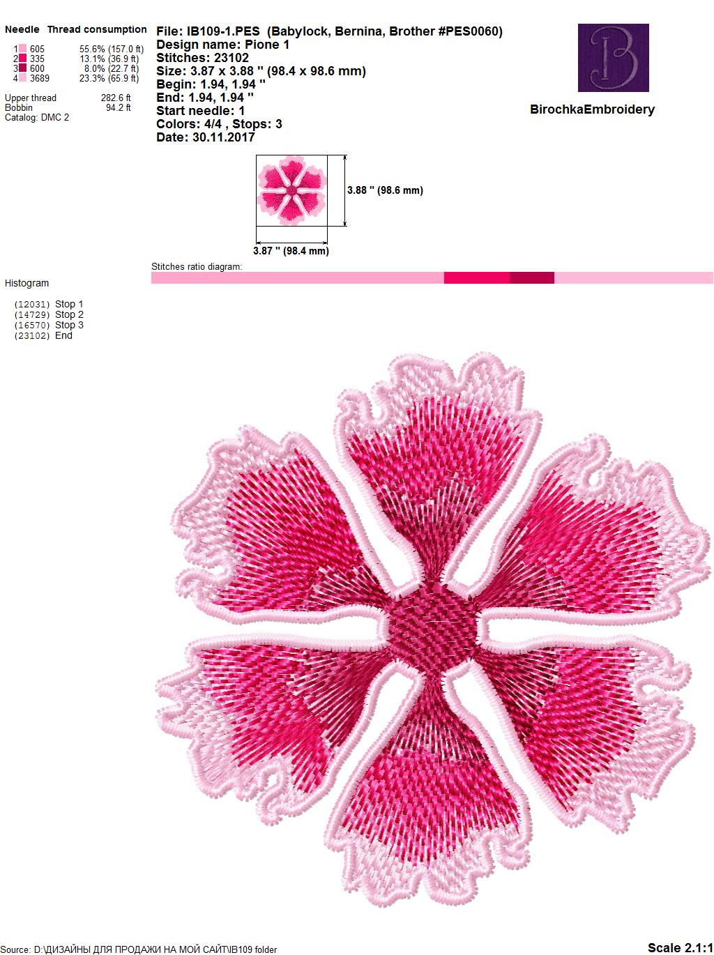 This design is embroidered on water-soluble stabilizer. The stabilizer is washed, dried and petals are formed. The middle part of the peony is embroidered two or three times according to your taste. All parts are sewn.