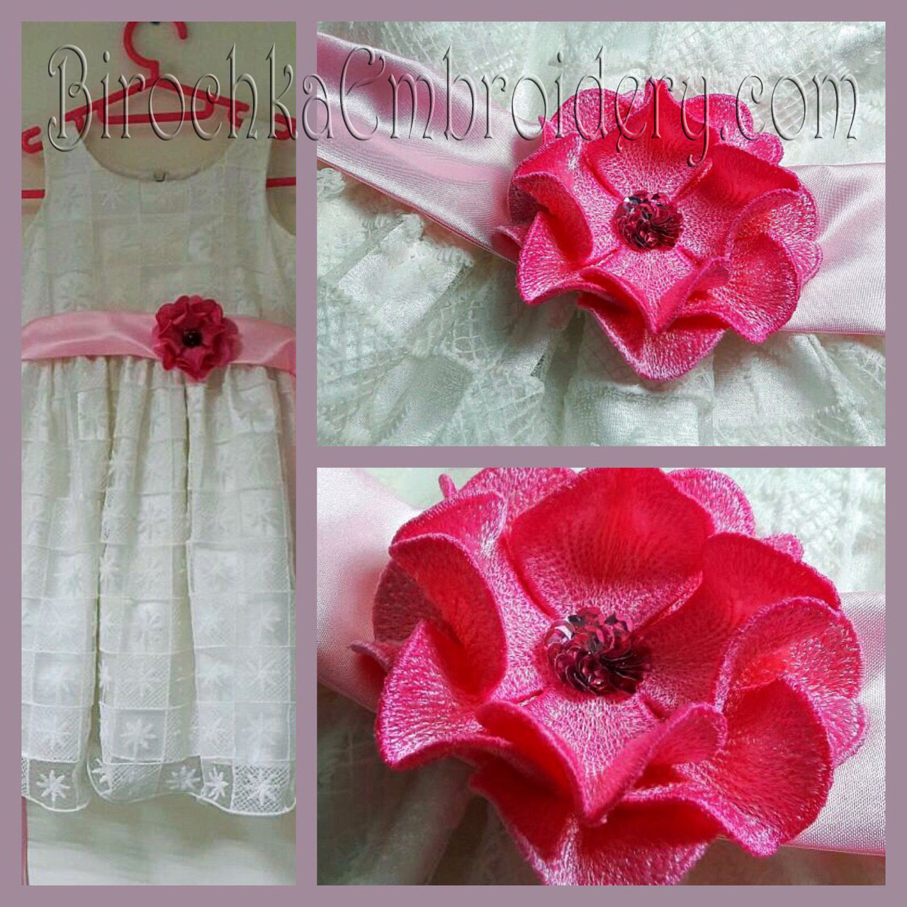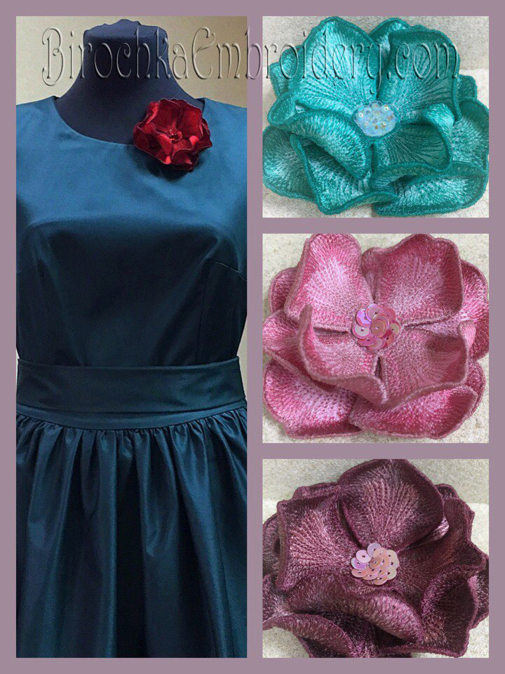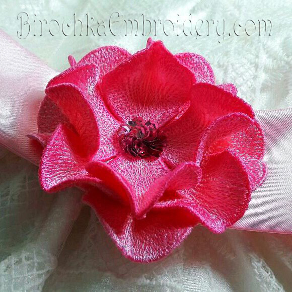 This design is embroidered on water-soluble stabilizer. The stabilizer is washed, dried and petals are formed. All parts are sewn. In the middle you can sew beads, beads or sequins.