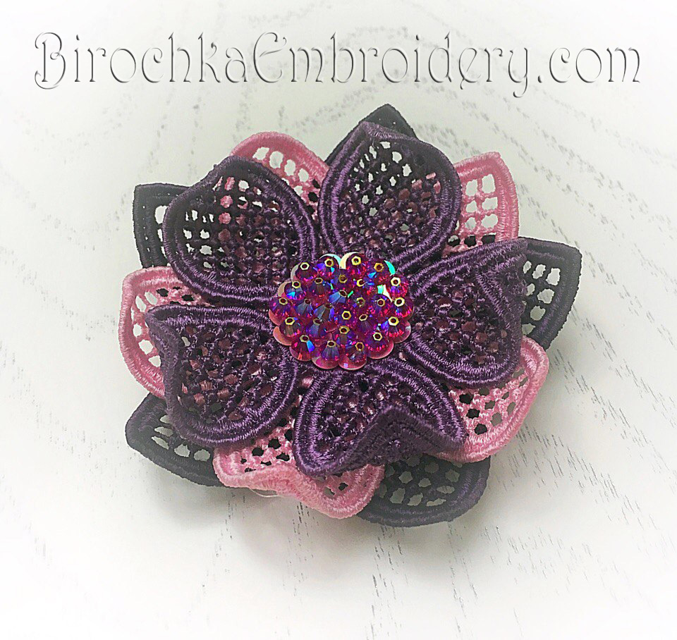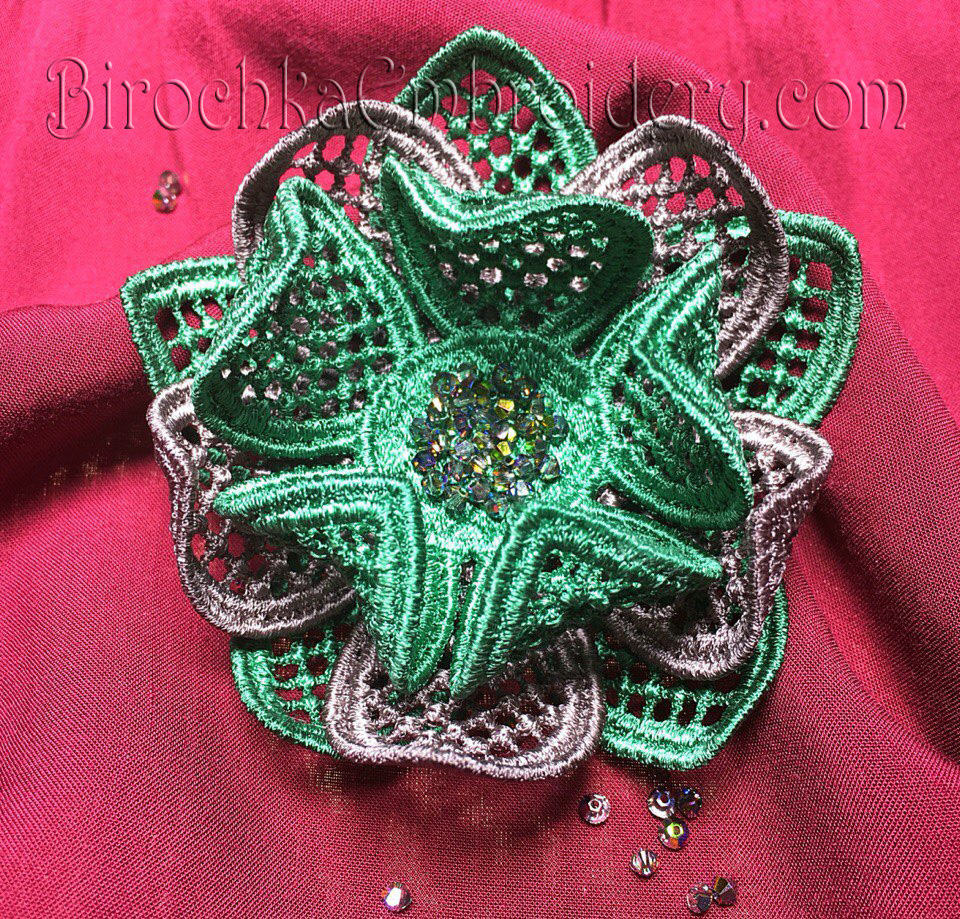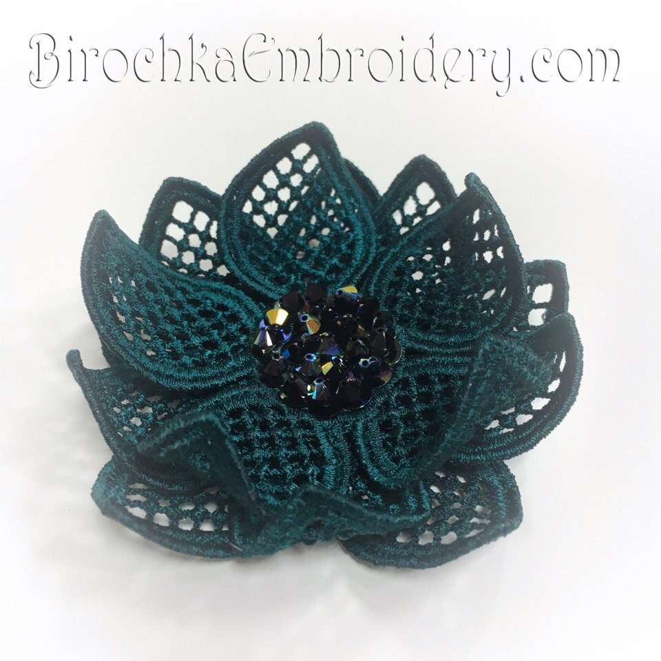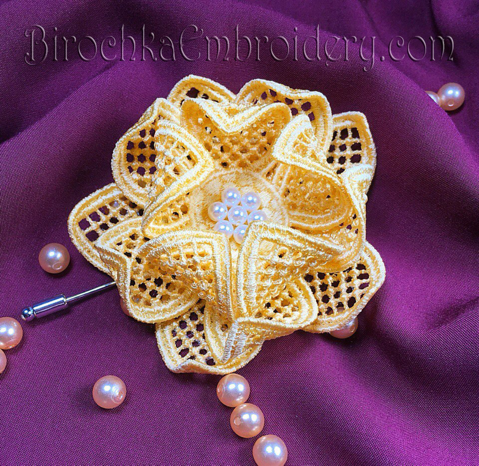 This design is embroidered on water-soluble stabilizer. The stabilizer is washed, dried and petals are formed. All parts are sewn. In the middle you can sew beads, beads or sequins