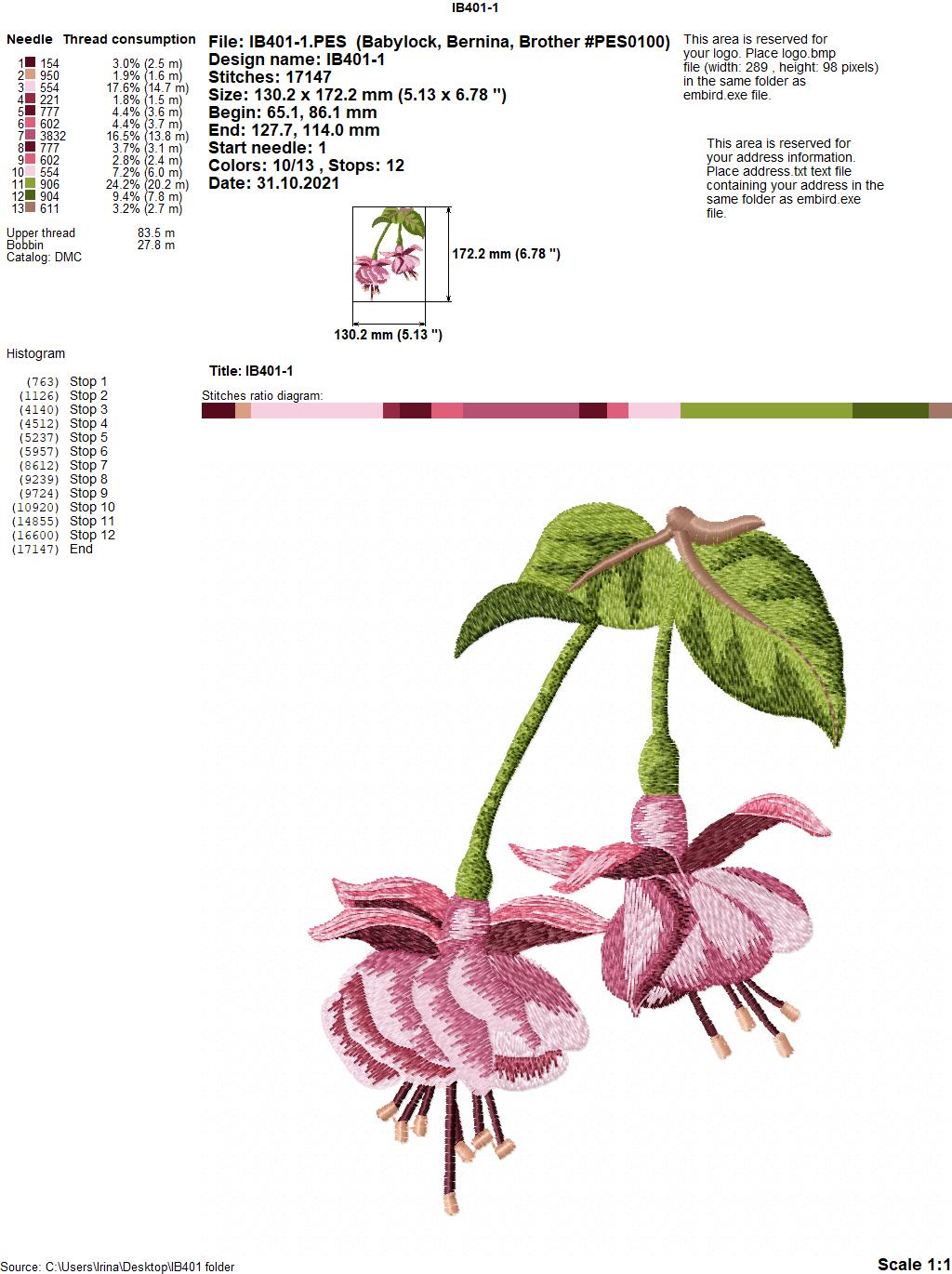 Размер дизайна IB401-1(веточка 1): 130,2 Х 172,2 мм (5,13 Х 6,78 дюйма)