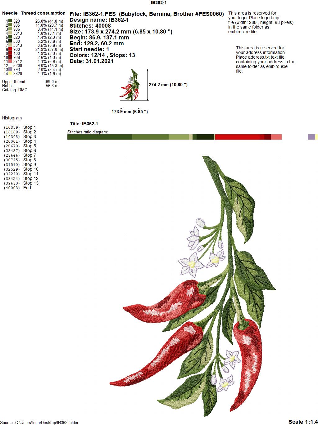 Design size IB362-1(sprig of three red peppers): 173,9 Х 274,2 mm (6,85 Х 10,80 inches )