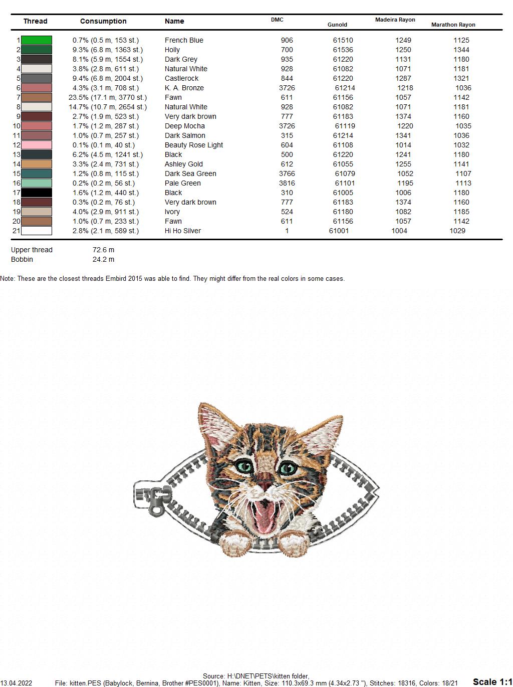 Размер дизайна Kitten: 110,3 Х 69,3 мм (4,34 Х 2,73 дюйма)