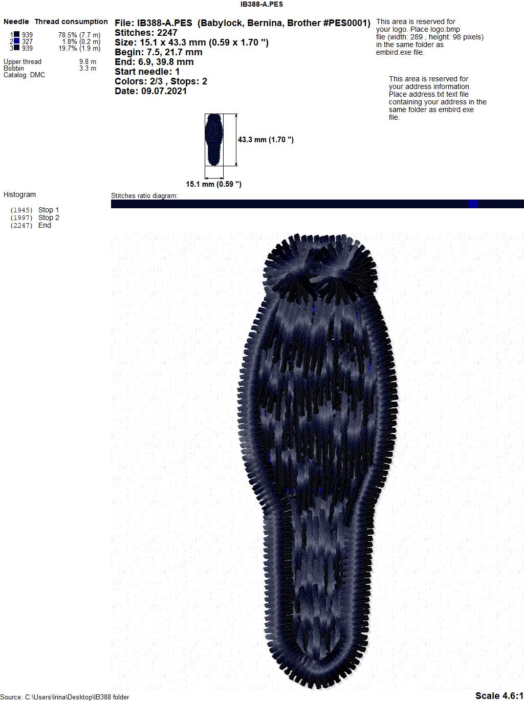 Размер дизайна IB388-A(тело бабочки): 15,1 Х 43,3 мм (0,59 Х 1,70 дюйма)