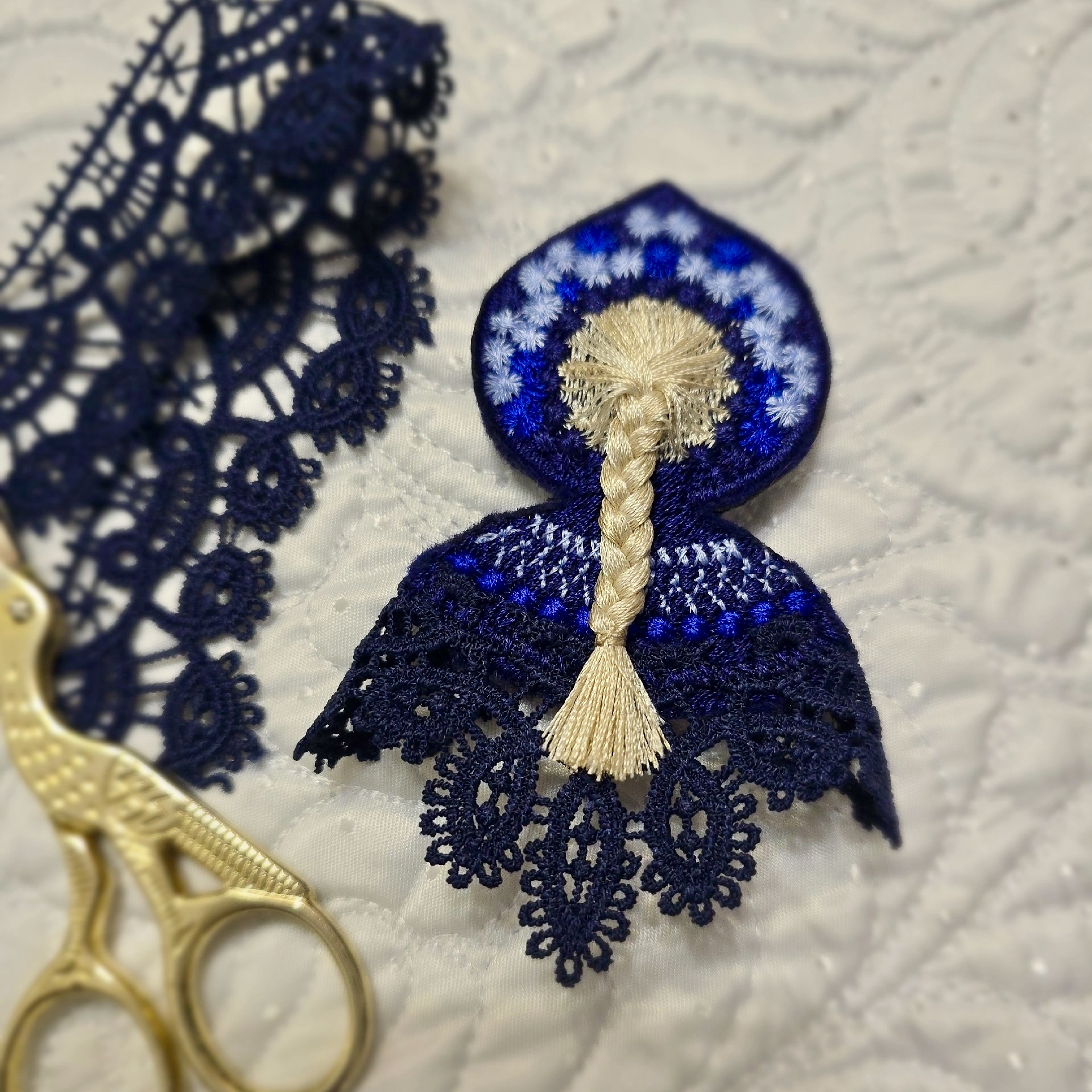 FSL (free standing lace) is not stitched onto fabric, but rather onto a water-soluble stabilizer, which when washed away leaves behind a lovely lace piece. Use these to create accessories, Christmas decorations, wall décor, and more!