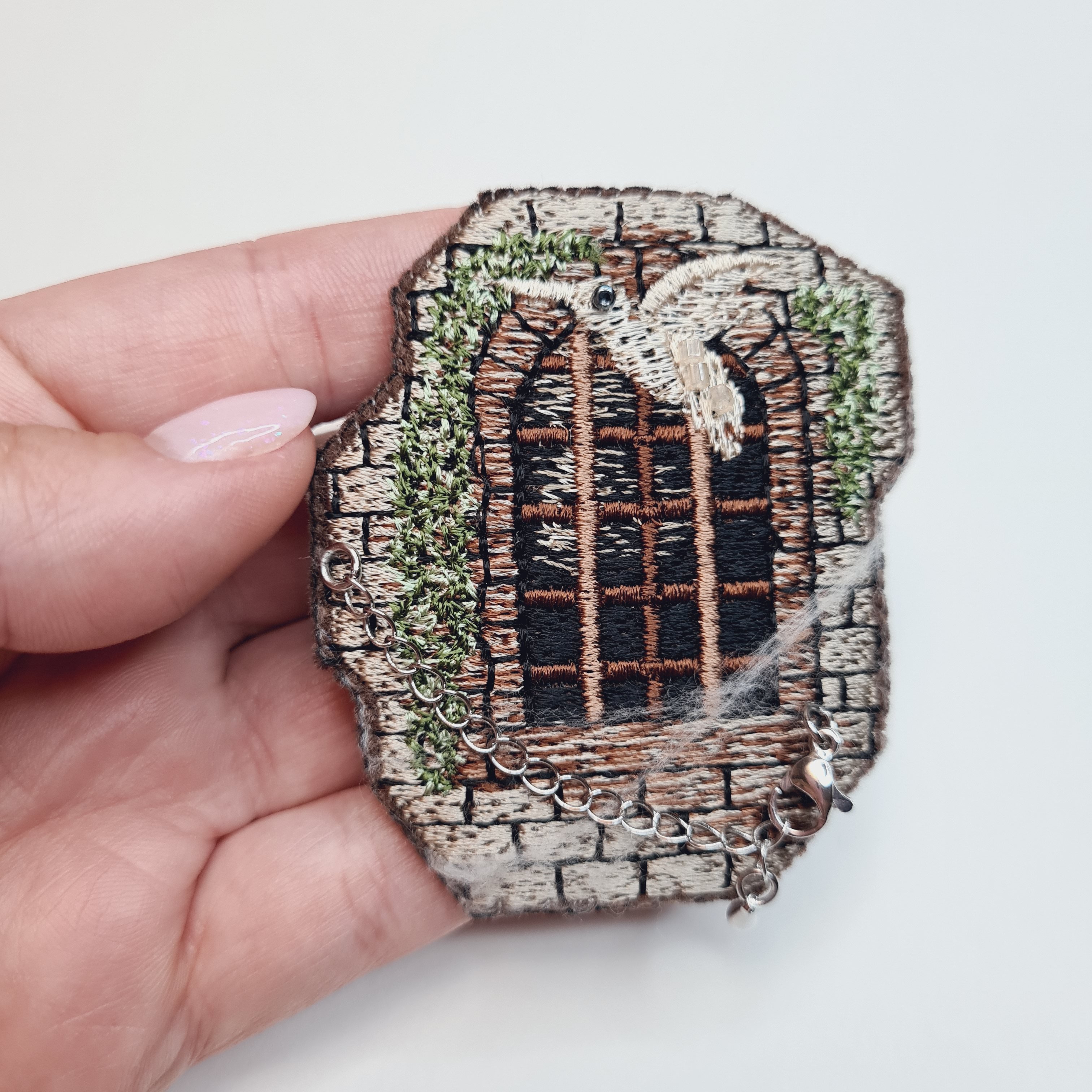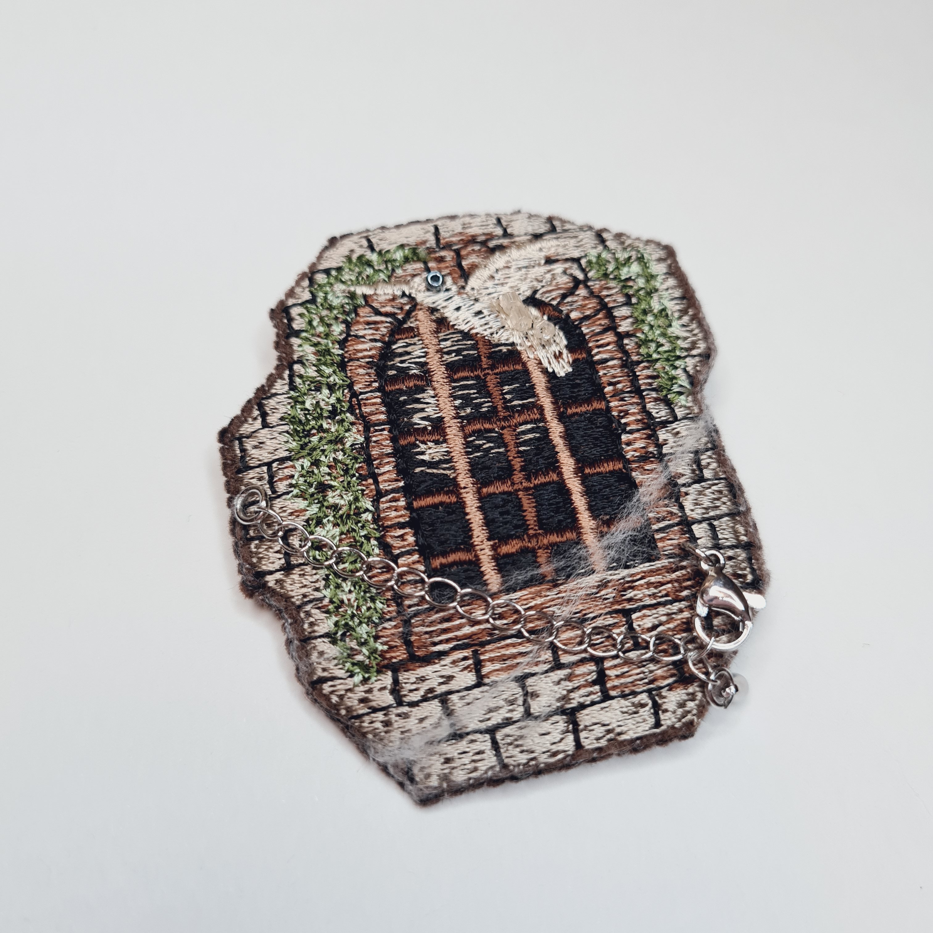 Machine embroidery design for art therapy: Brooch " Window of the old castle"