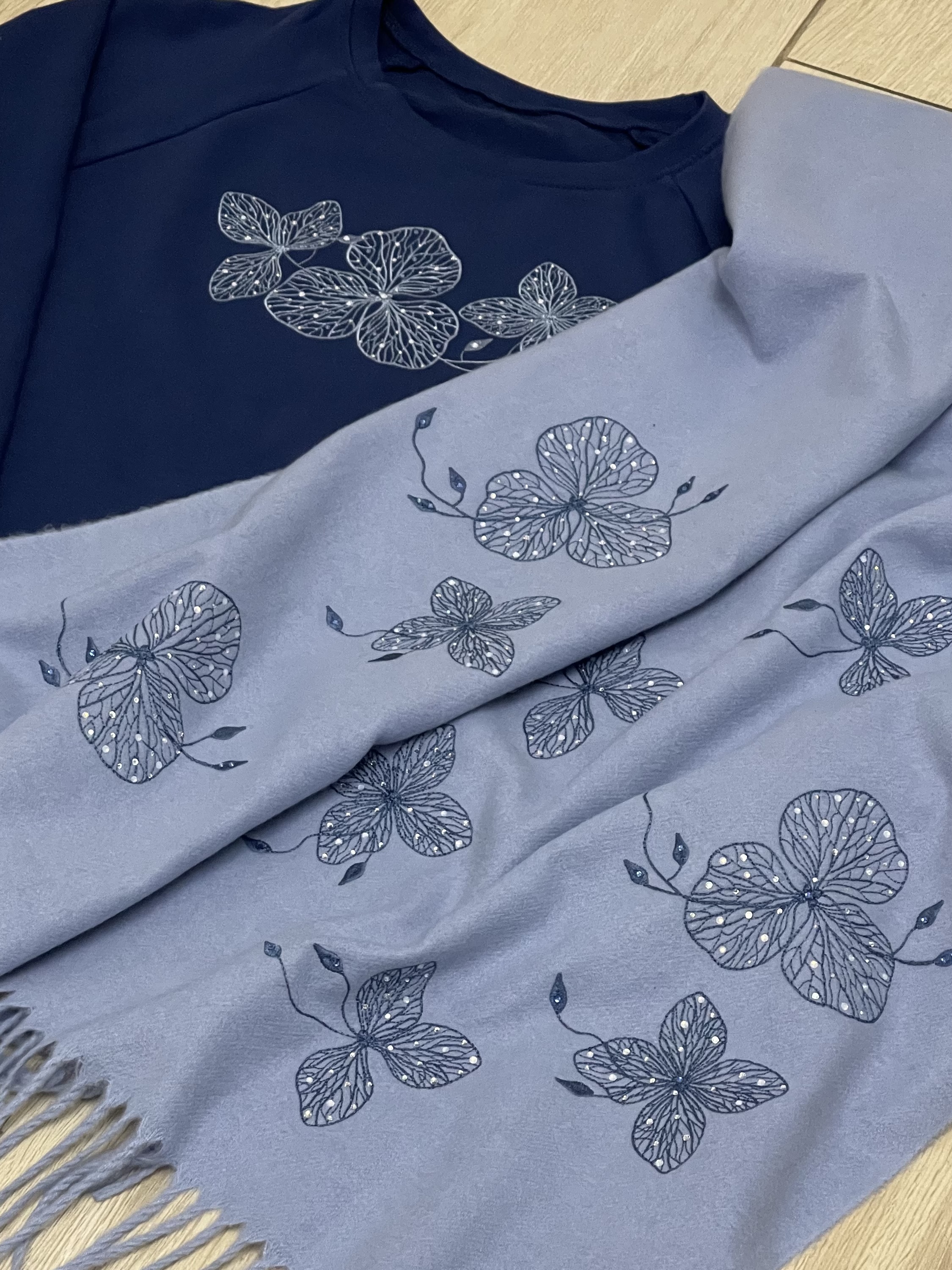 The design is created specifically to combine machine embroidery techniques and rhinestone inlay to achieve the effect of fragile frosty flowers with ice drops.