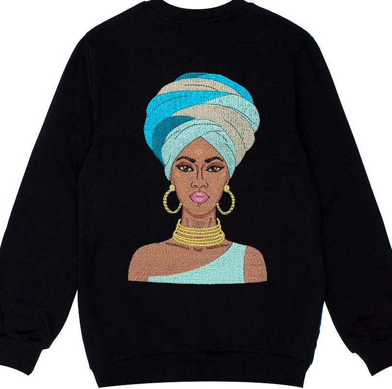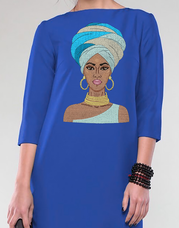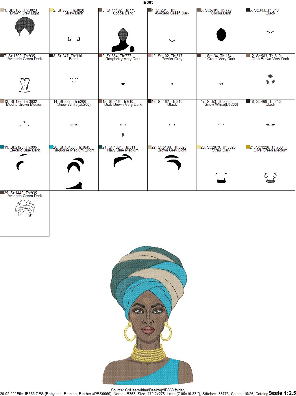 This design is for embroidery on dense fabrics. Be sure to stabilize the fabric well. The first color in the design is the backing for the headdress. Embroider this color to match the fabric on which you embroider this design. Consider the selection of threads for the face carefully. Try to use threads as similar in tone as possible to the color scheme of the design. You can experiment with the colors of the girl’s headdress and embroider it with the colors you like.