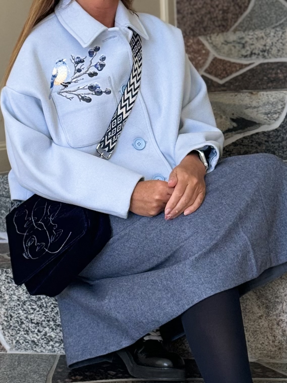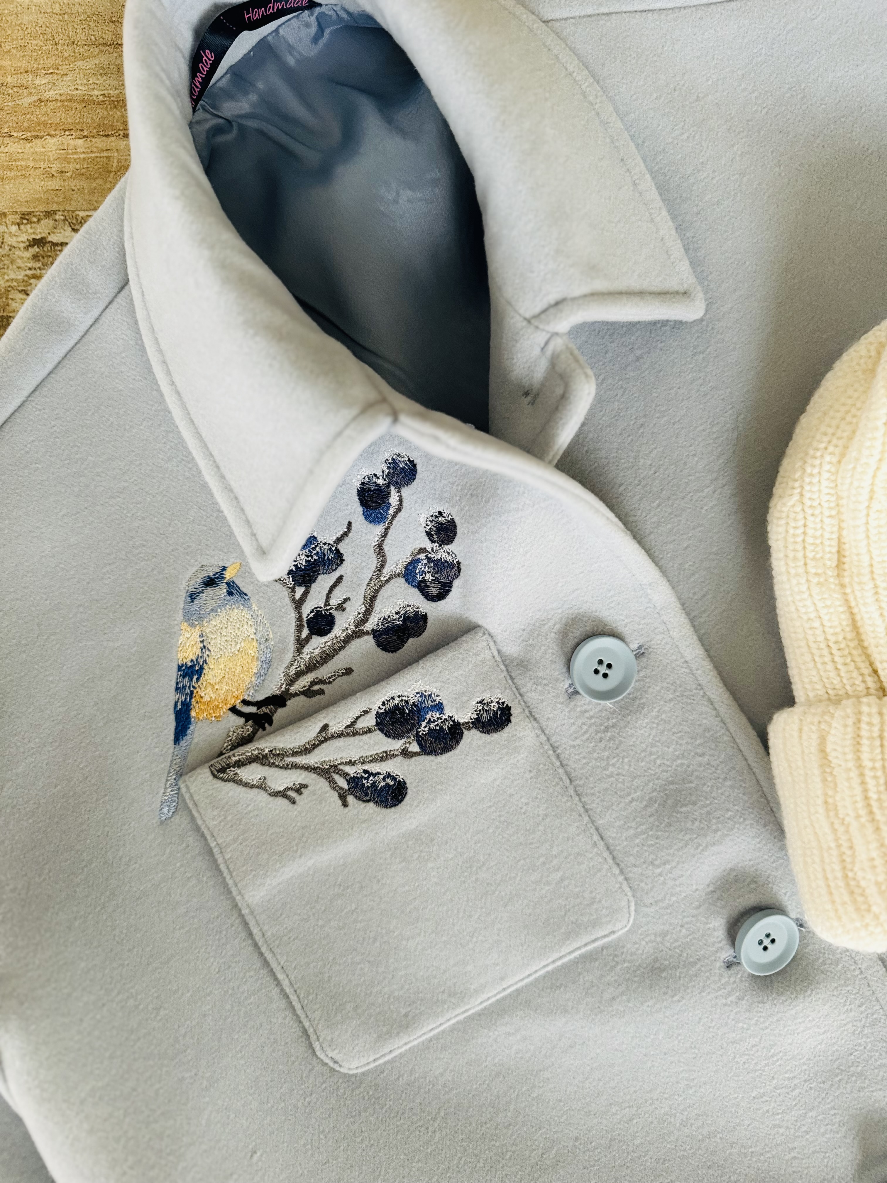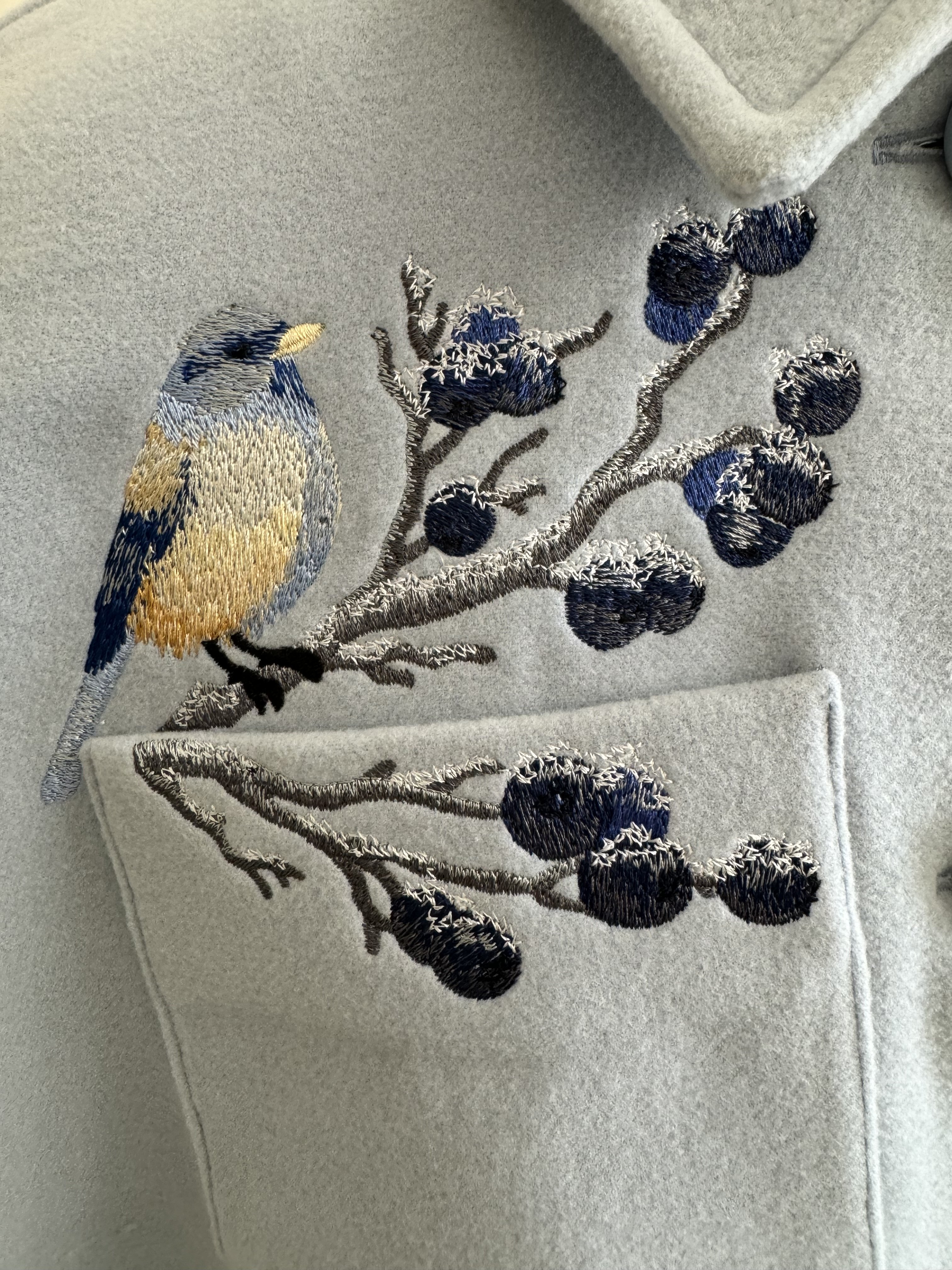Machine embroidery design "Titmouse and blueberry" is created for embroidery and decoration of pockets. Part of the branch is embroidered on the pocket itself, and the main part of the branch with the titmouse is embroidered just above the pocket. Design in two sizes.
