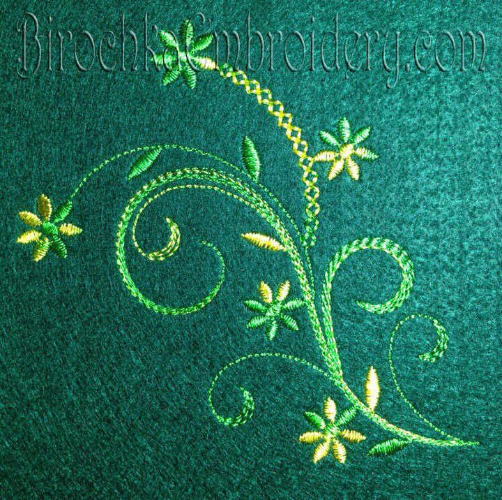 This design is embroidered on water-soluble stabilizer. The stabilizer is washed, dried and petals are formed. All parts are sewn.