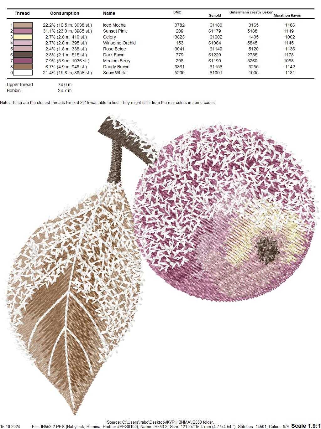Please be aware that the quality of the final product will be greatly affected by factors other than the design itself. For best results, make sure to follow the instructions exactly, use the correct machinery (type, size, etc.,), be aware of how embroidery looks on different fabrics and use the appropriate stabilizer for your project.