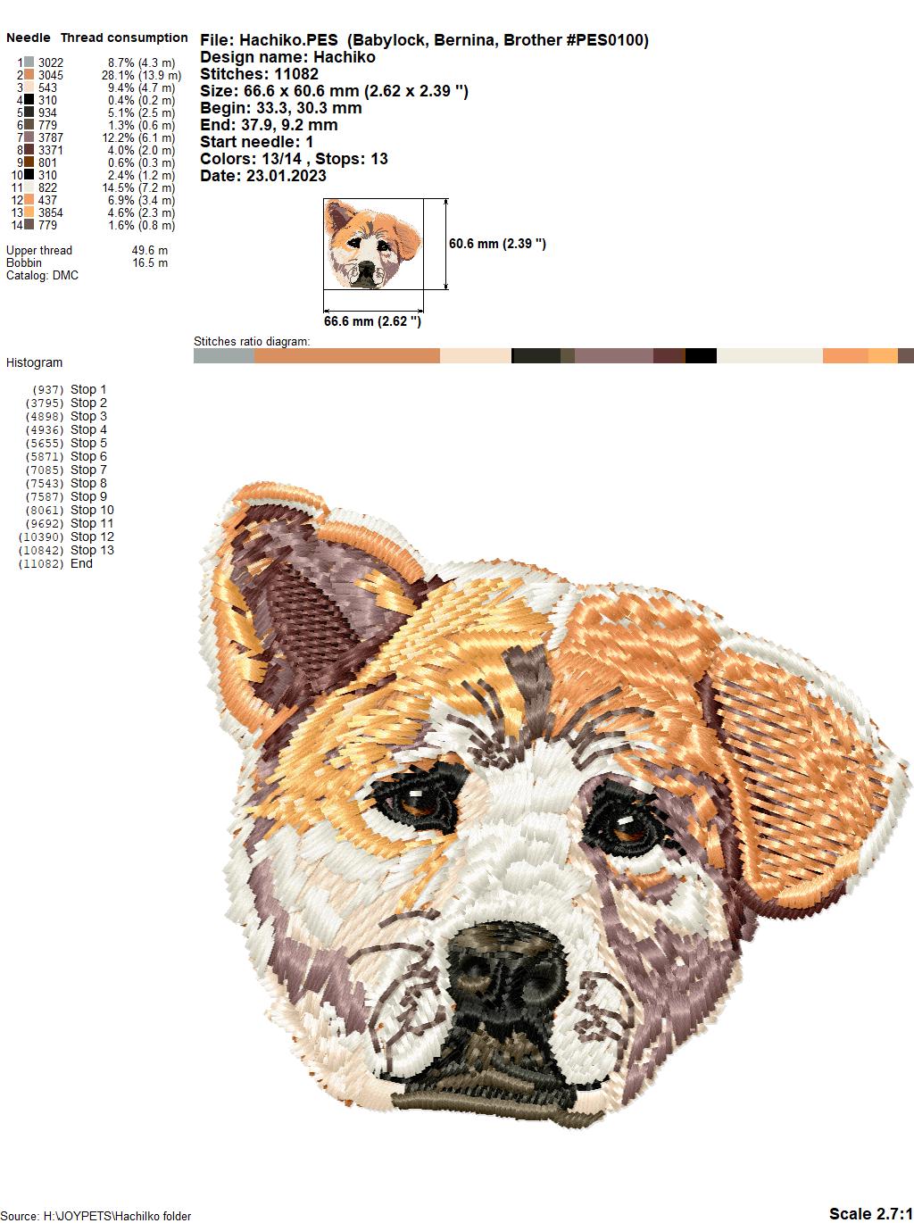 Дизайн машинной вышивки Хатико создан по фотографии настоящего Хатико, цвет подобран исходя из породы и по мотивам Хатико из фильма.