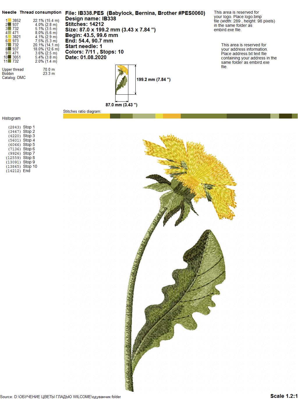 Одуванчик дизайн машинной вышивки в технике художественная гладь