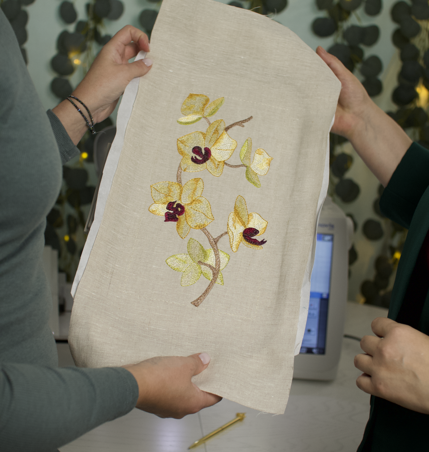 Орхидея дизайн машинной вышивки в технике художественной глади