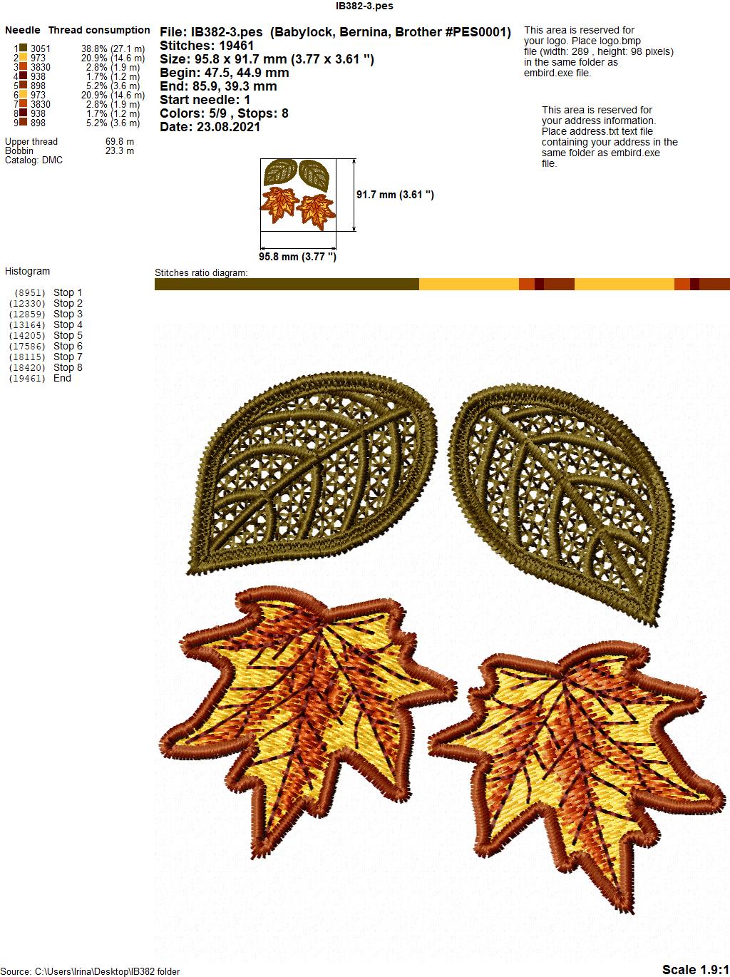 Размер дизайна IB382-1(один вид листиков): 32,1 Х 50,0 мм (1,26 Х 1,97 дюйма )
