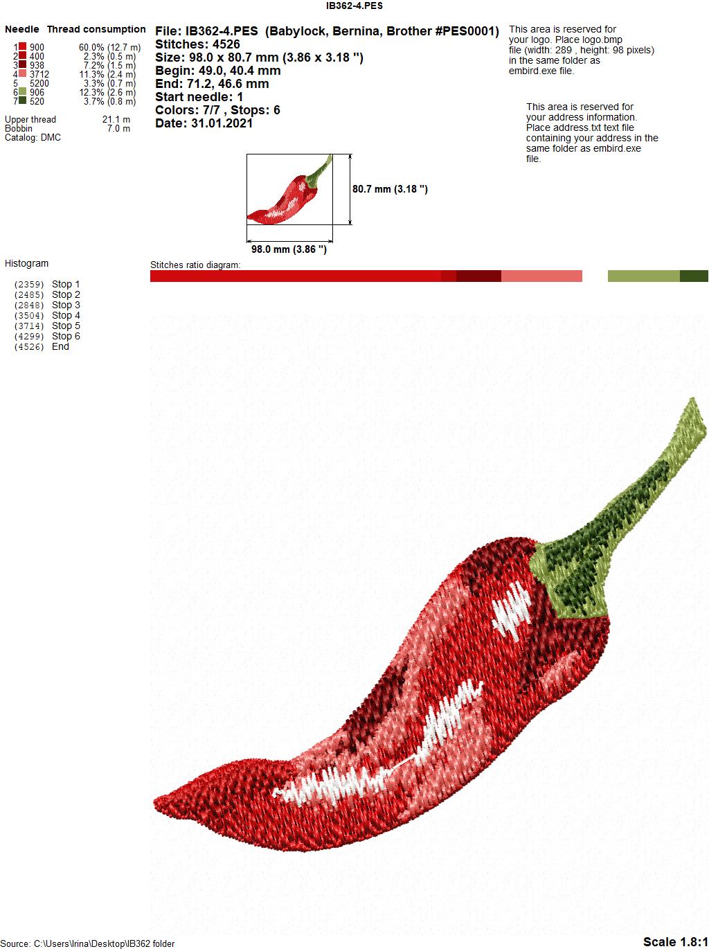 Размер дизайна IB362-7(перец): 42,6 Х 71,8 мм (1,68 Х 2,83 дюйма)