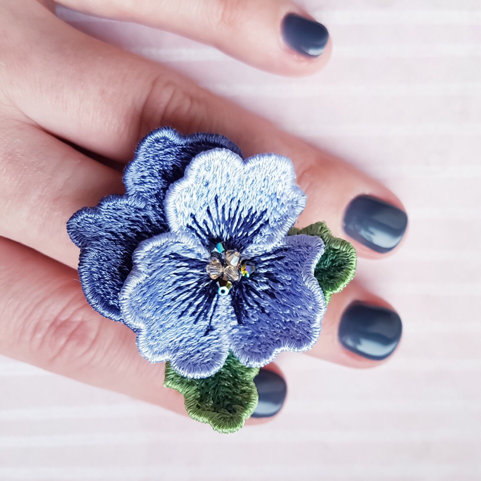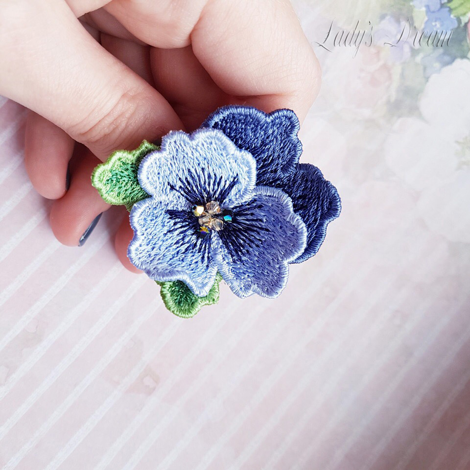 This design is embroidered on water-soluble stabilizer. The stabilizer is washed, dried and petals are formed. All parts are sewn. In the middle you can sew beads, beads or sequins