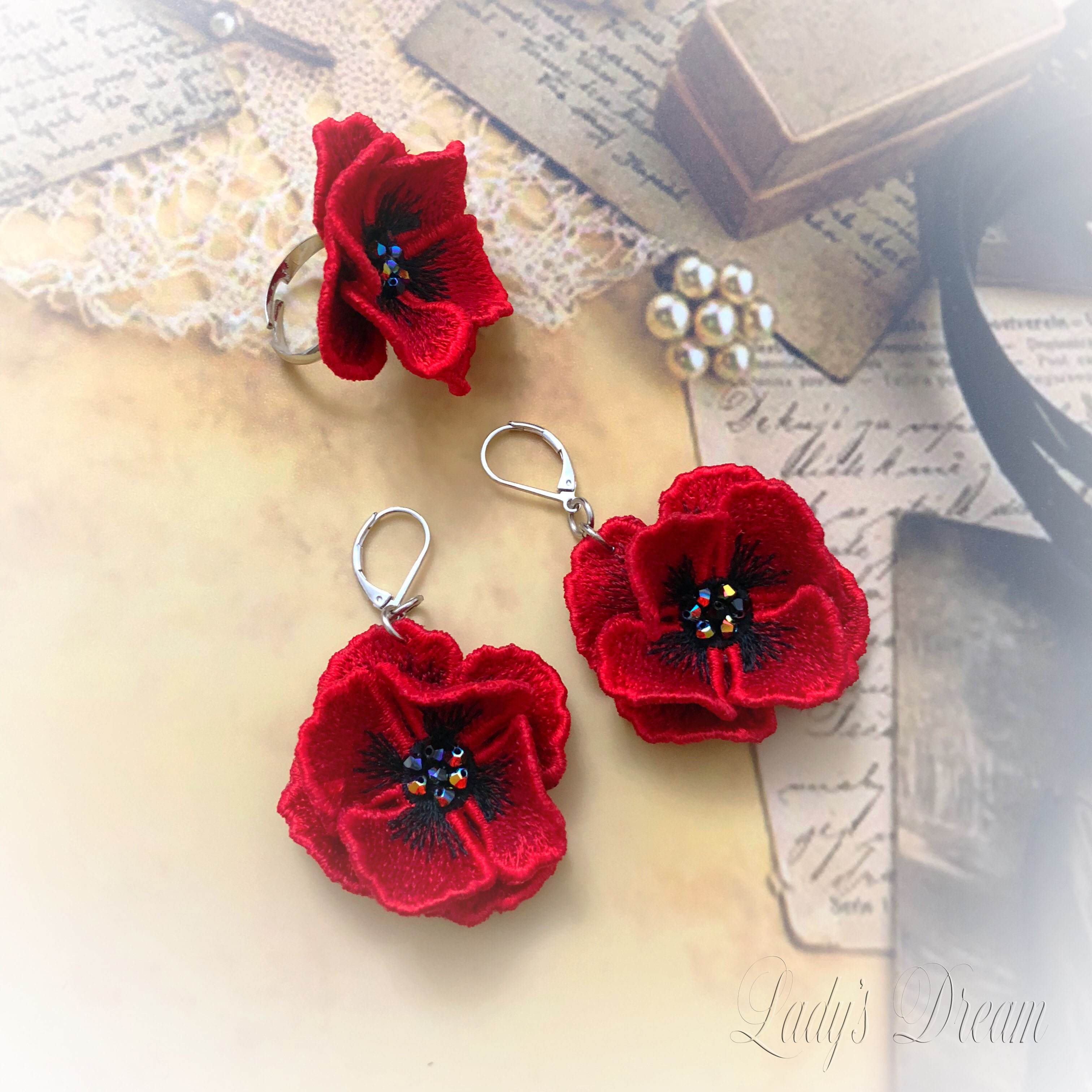 This design is embroidered on water-soluble stabilizer. The stabilizer is washed, dried and petals are formed. All parts are sewn. In the middle you can sew beads, beads or sequins