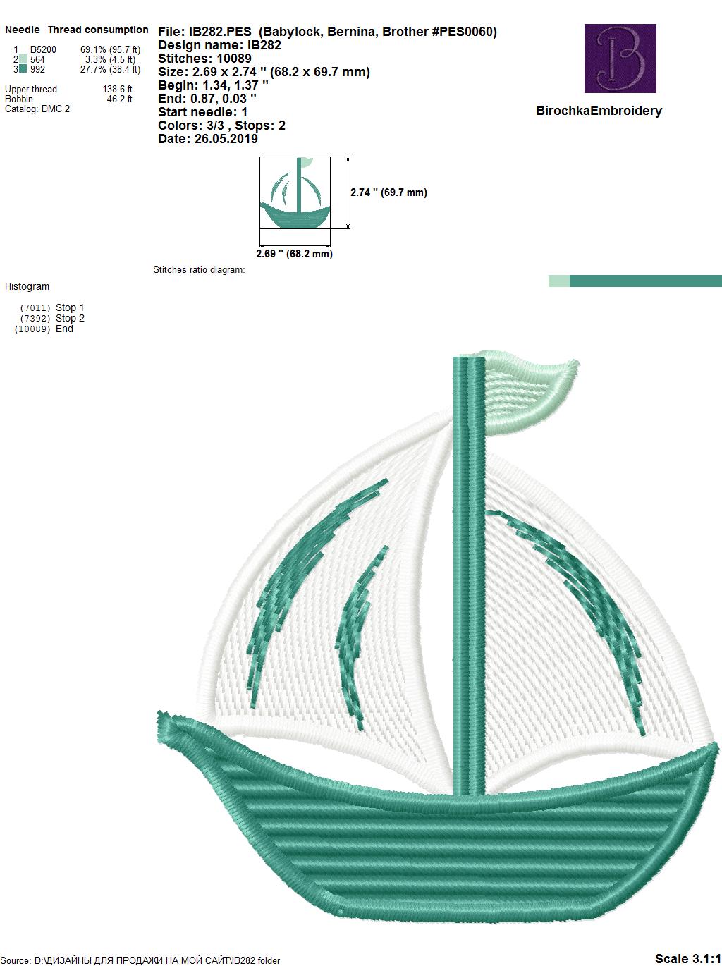 Design size Sailboat: 68,2 Х 69,7 mm (2,69 x 2,74 inches)