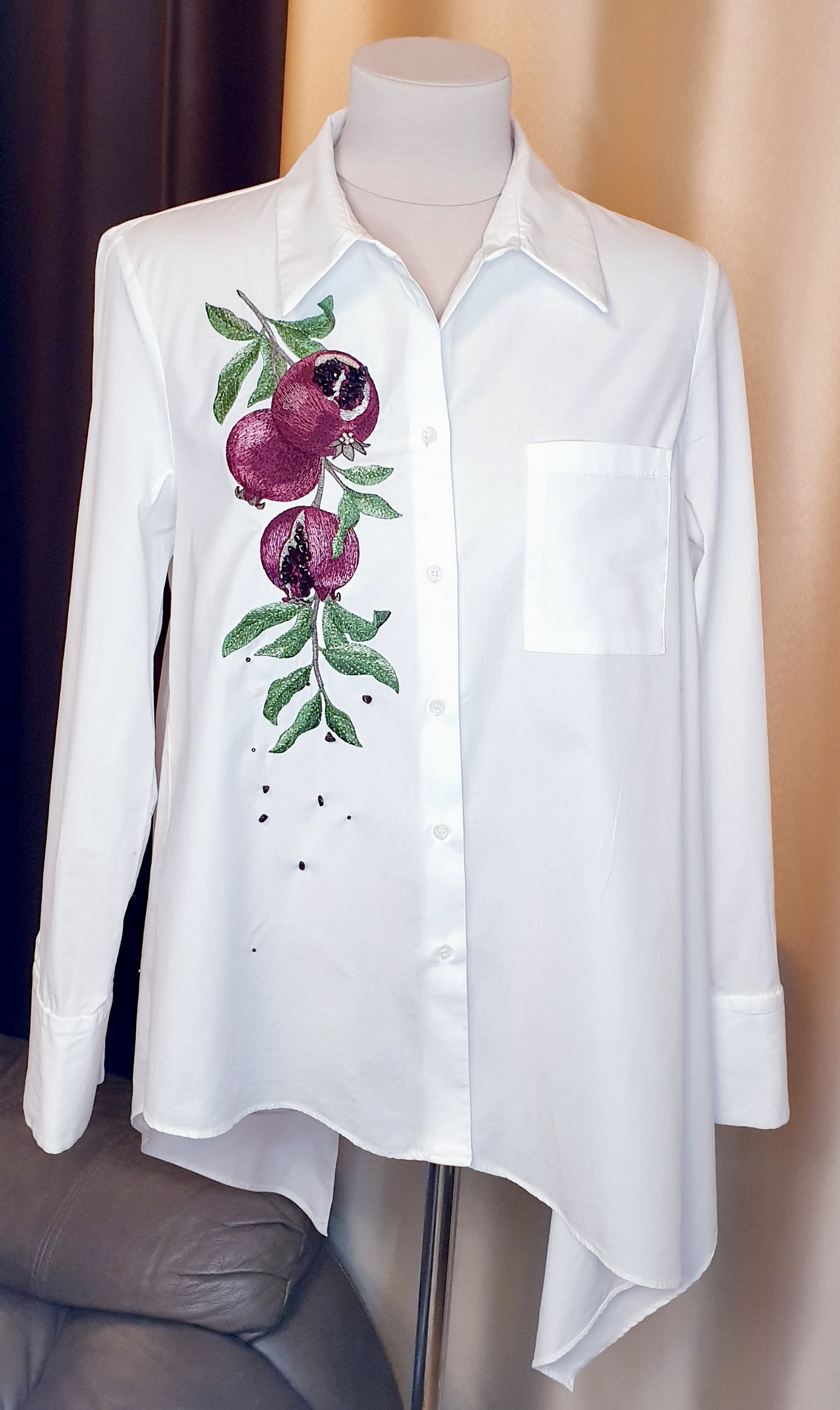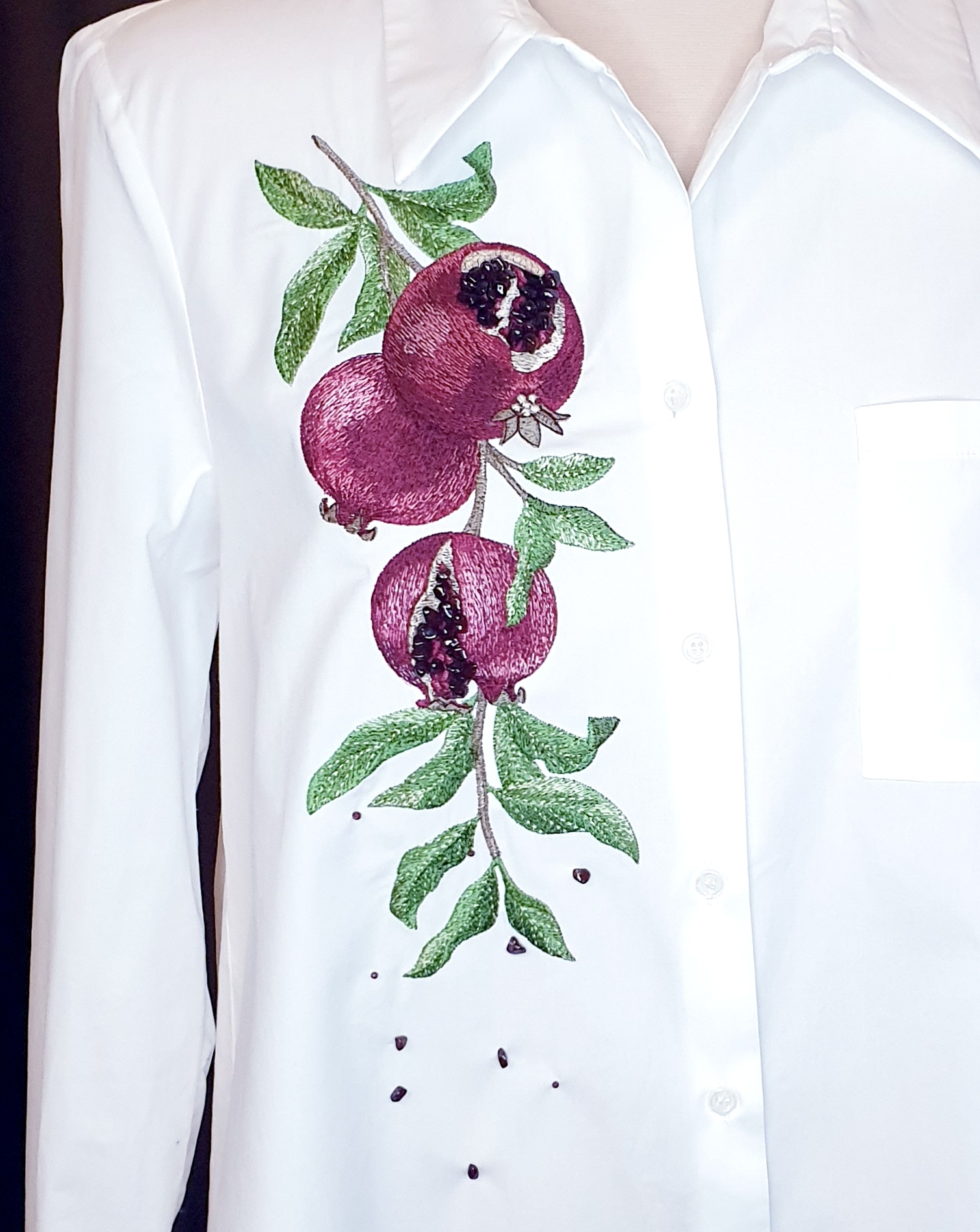 Для этого можно пропустить вышивку зерен граната или пришить камни прямо к ним. На своей фотографии я вышила зерна граната и добавила косточки вручную.