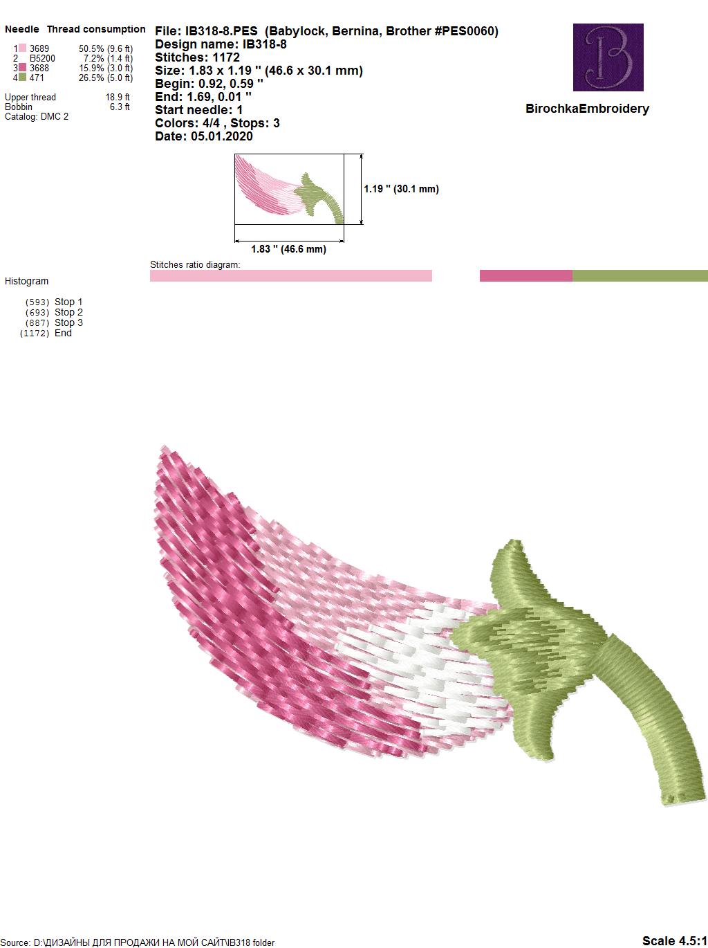 Design size IB318-8(flower): 46,6 Х 30,1 mm (1,83 Х 1,19 inches )