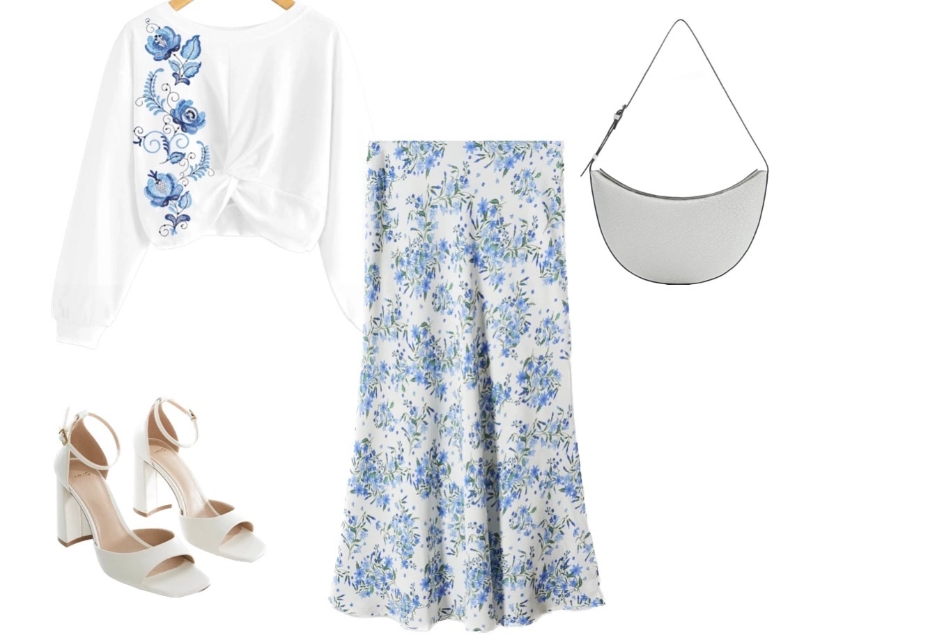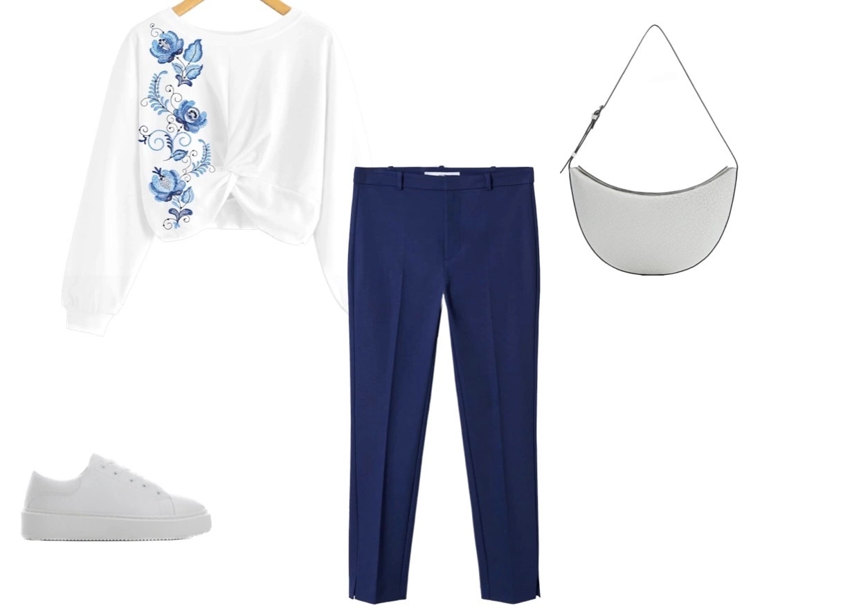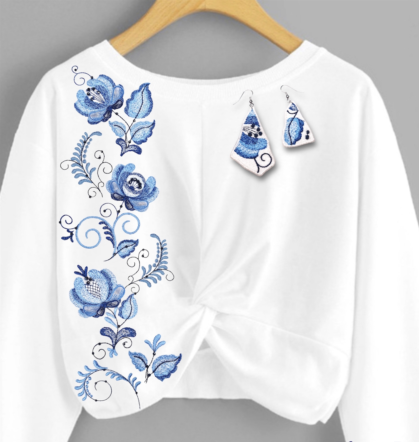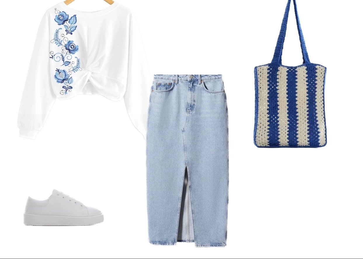 A set of gzhel pattern stylization designs for creating modern outfits with elements of folk style. Please note that the design is accompanied by image options created by a professional stylist, Irina Malinina.