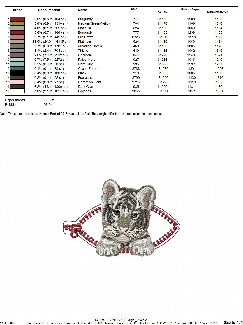 Design size Tiger2: 110,3 Х 73,7 mm (4,34 Х 2,90 inches )