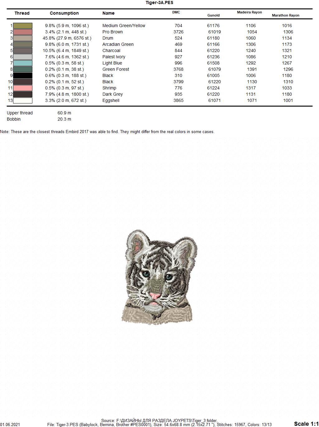Design size Tiger3: 54,6 Х 68,8 mm (2,15 Х 2,71 inches )