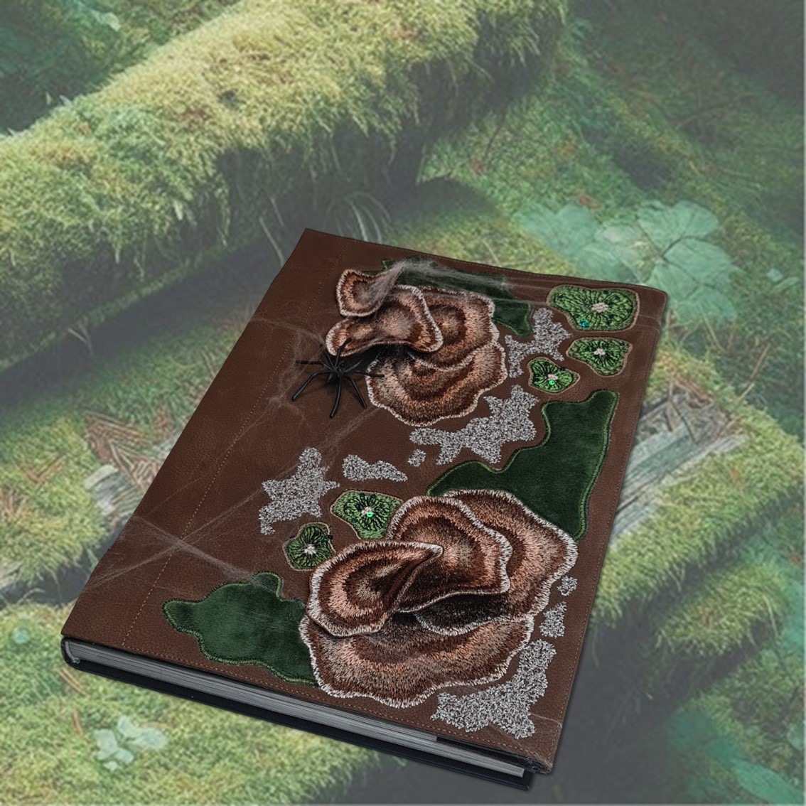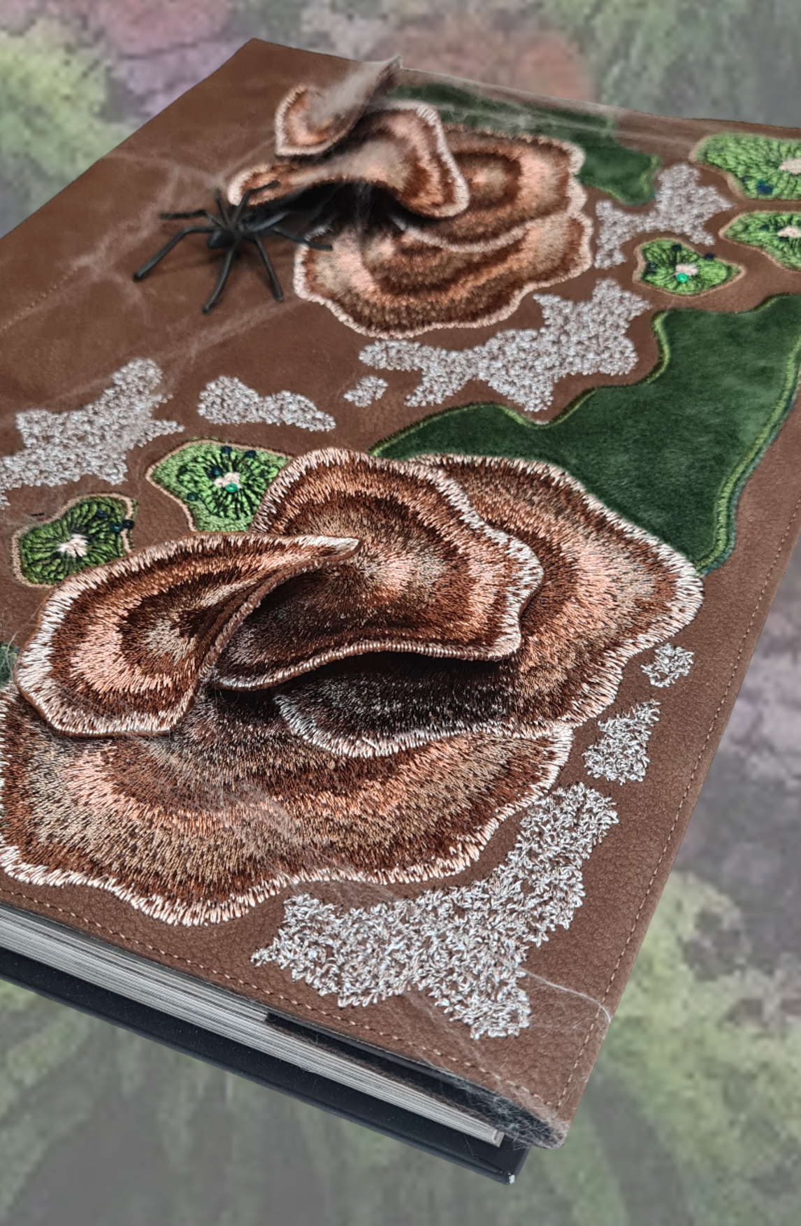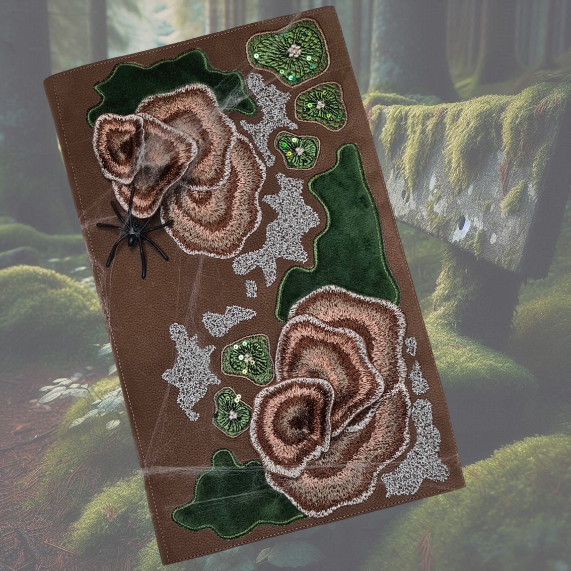 A design composition of imitation tree bark with mold, moss and mushrooms, created for embroidery on a bag, clutch, diary cover and other accessories.