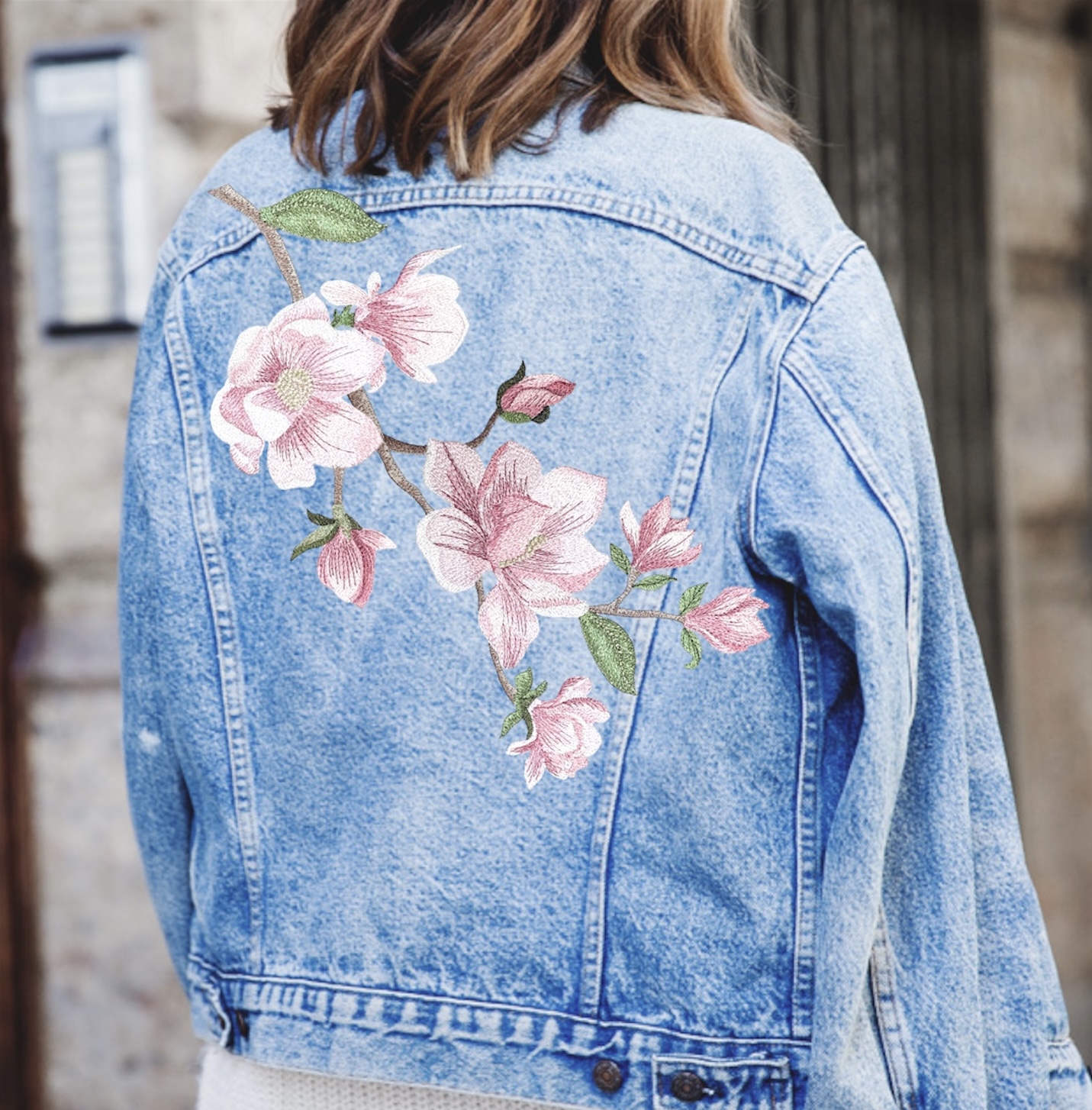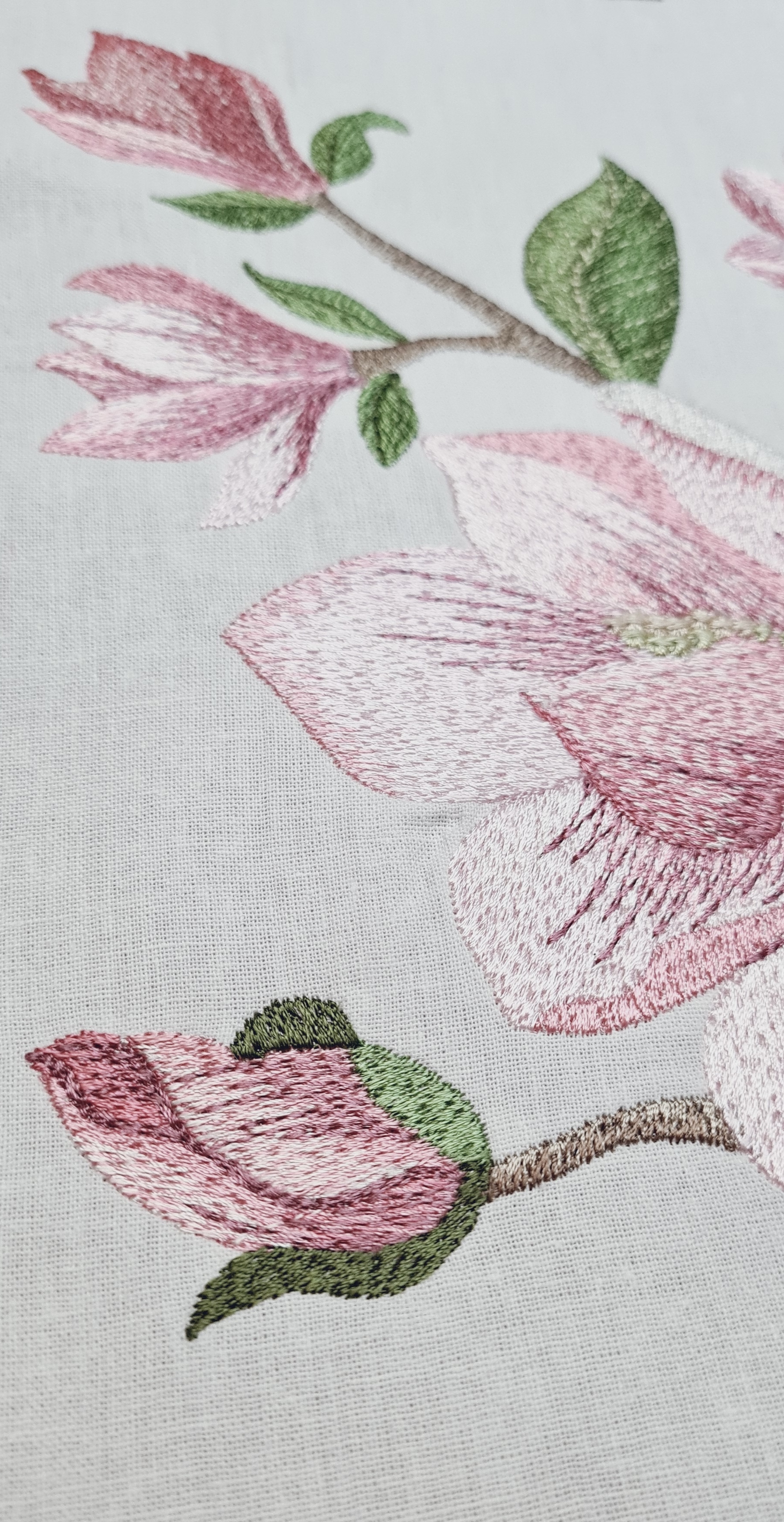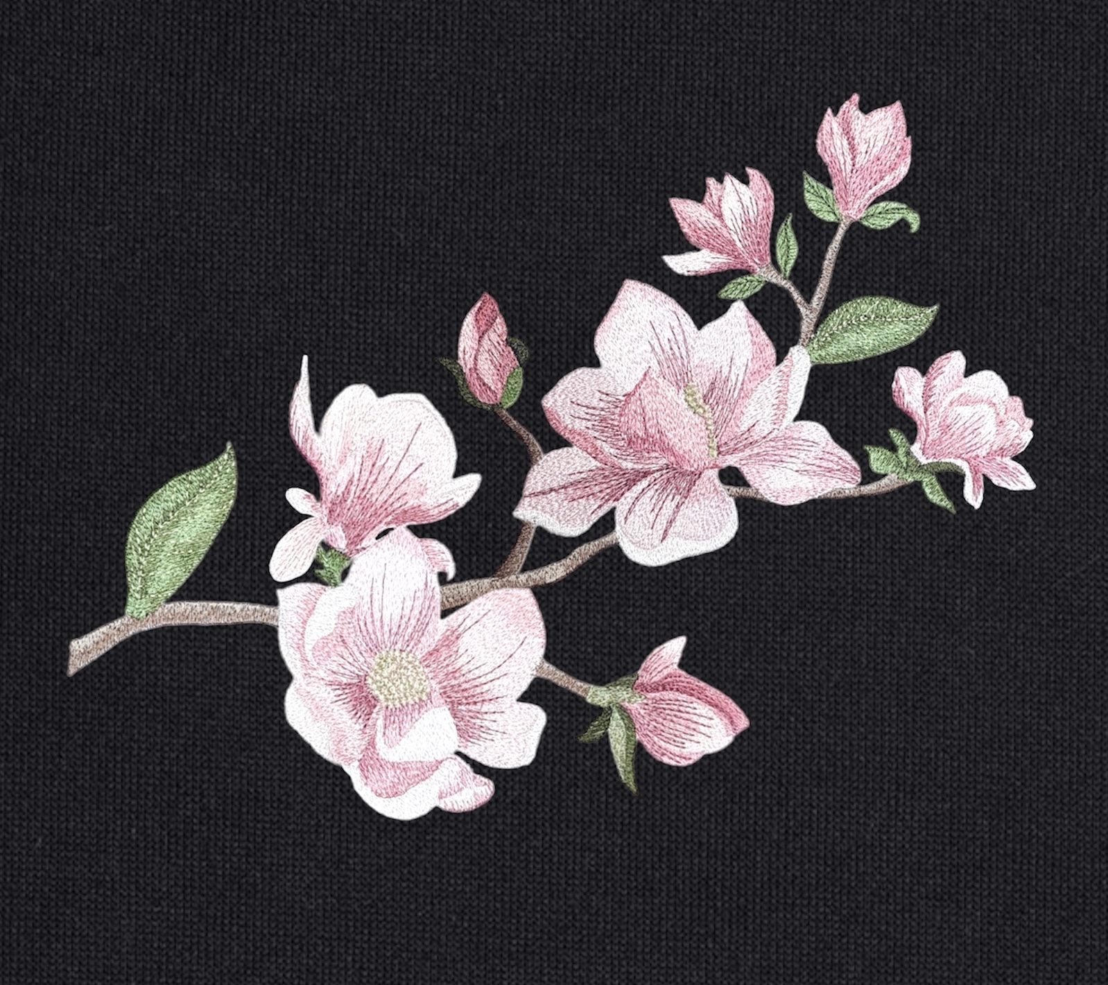 Веточка магнолии в технике художественная вышивка дизайн машинной вышивки
